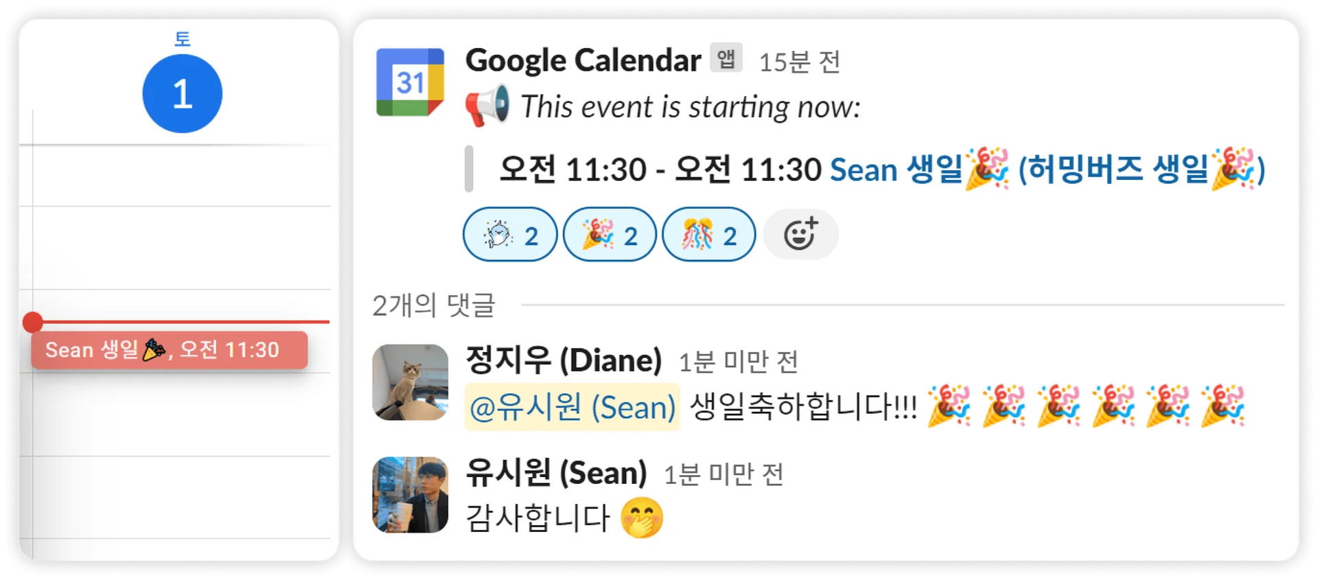 설정을 완료하고, 연동한 구글 캘린더에 구성원들의 기념일 일정을 매년 반복 일정으로 등록해 두면 설정한 채널로 구성원들의 기념일 알림 메시지가 자동으로 발송됩니다.