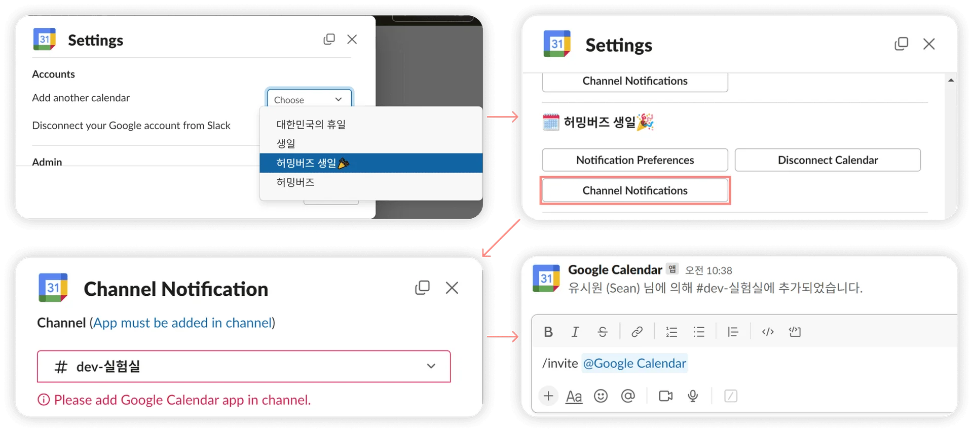 • 알림이 오게 할 채널에서 /invite @Google Calendar로 구글 캘린더 앱 추가