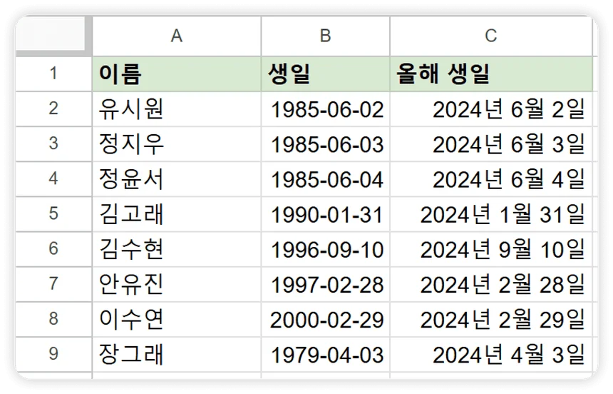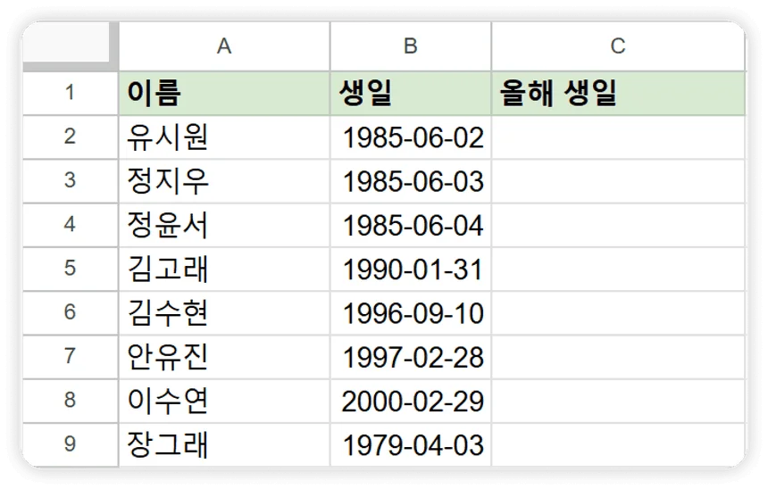 Step 2. 구글 스프레드시트에서 형식에 맞게 올해 생일 열 채우기