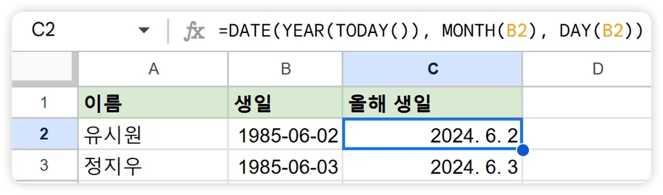 올해 생일 열의 C2 셀에 =DATE(YEAR(TODAY()), MONTH(B2), DAY(B2)) 라고 입력해 주세요. 여기서 B2 자리는 바로 옆 해당하는 생일 데이터의 셀 번호예요.