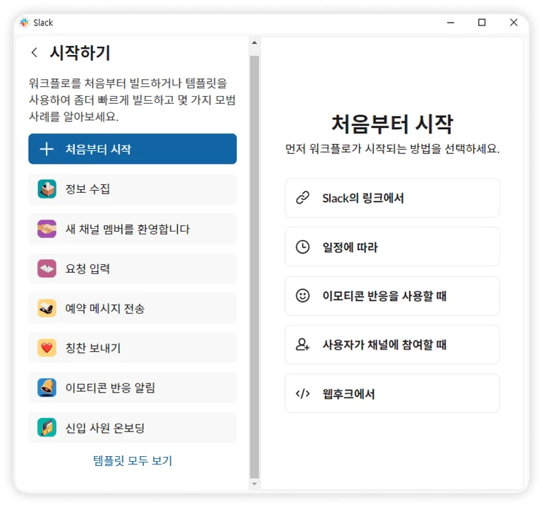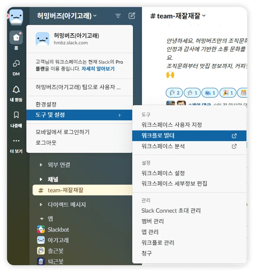 슬랙 워크스페이스에서 좌측 상단 워크스페이스 이름을 클릭한 후, 도구 및 설정 > 워크플로 빌더 메뉴를 선택해 워크플로 작성기를 열어주세요.