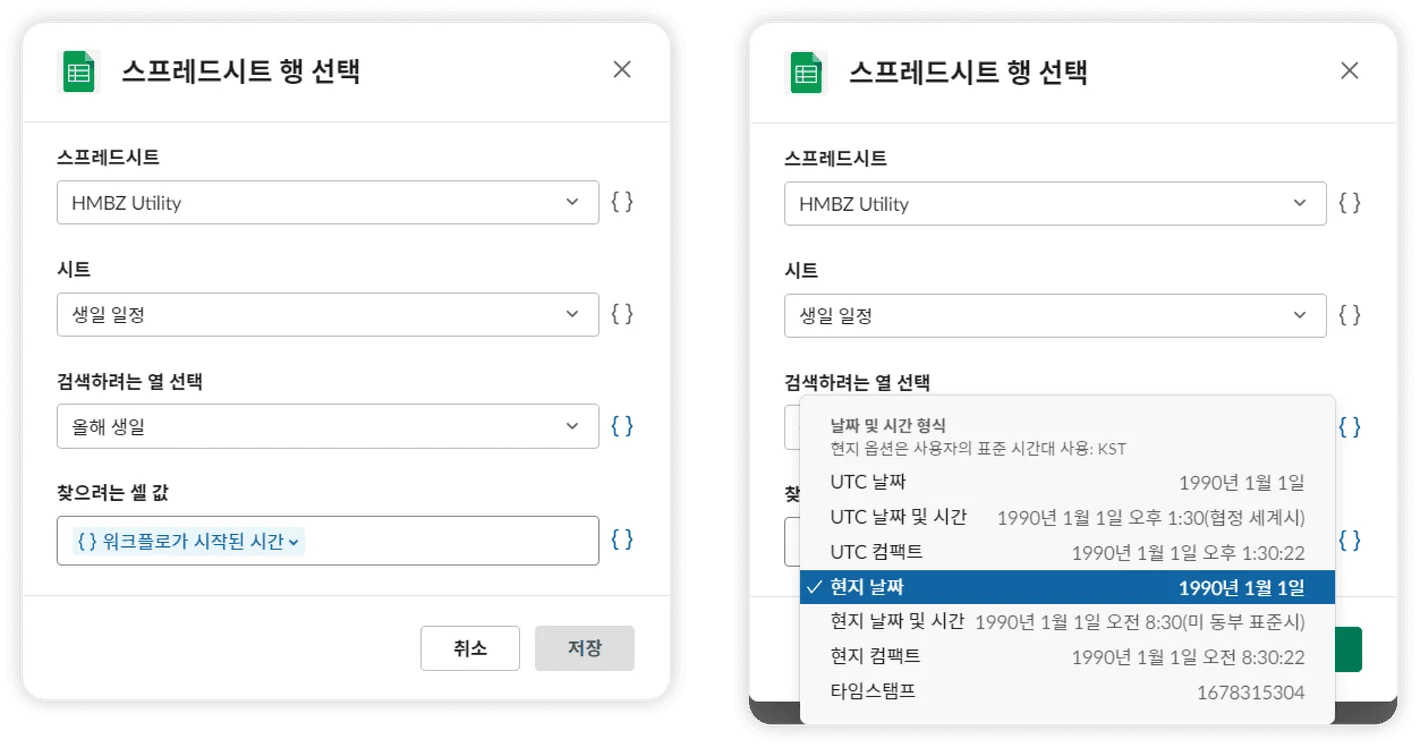 앞서 만든 스프레드시트를 연결하고, 검색하려는 열을 올해 생일 열로 선택해 주세요. 찾으려는 셀 값은 워크플로가 시작된 시간 으로 선택하면 나오는 아래 방향 화살표를 클릭하고, 날짜 시간 및 형식을 YYYY년 M월 D일 형식의 현지 날짜로 선택해 주세요.