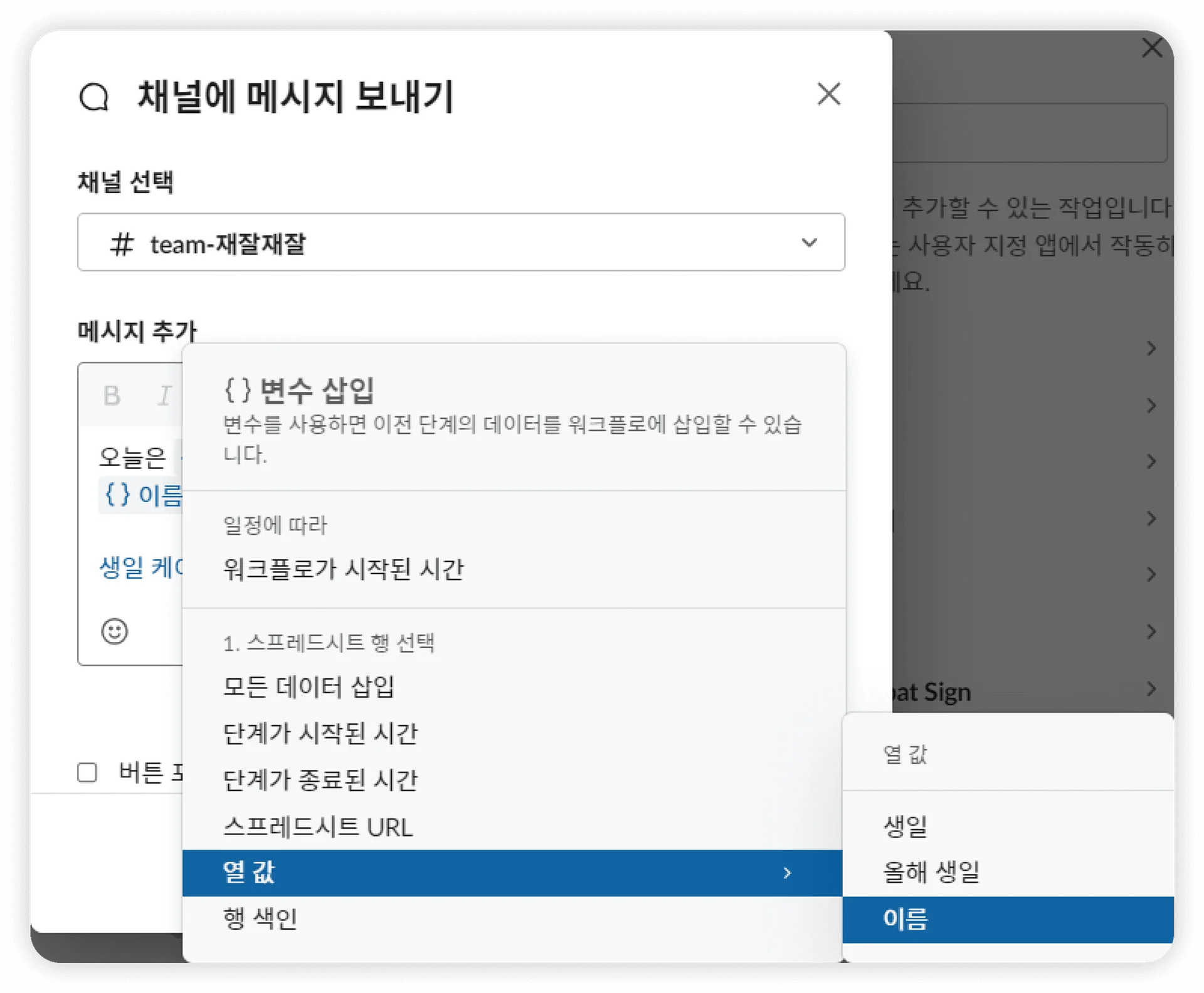 생일 축하 메시지가 전송될 채널을 선택하고 메시지를 작성해 주세요. 변수 삽입을 선택해 스프레드시트의 데이터를 활용할 수 있어요. 열 값 > 이름을 선택하면 스프레드시트에 기재해 둔 생일자의 이름을 포함해 메시지를 작성할 수 있어요.