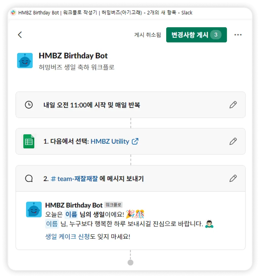 완성된 워크플로의 모습은 아래와 같아요. 우측 상단 변경사항 게시 버튼을 눌러 워크플로를 게시해주세요.