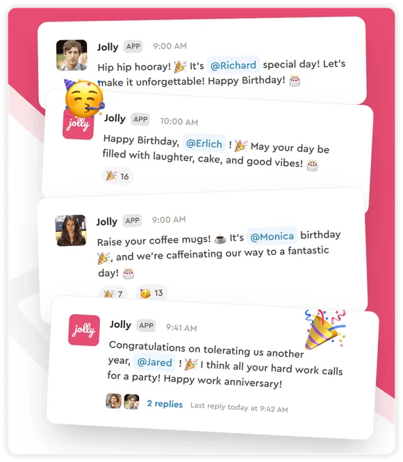 Jolly는 구성원 생일과 입사 기념일 축하 메시지 전송을 자동화해주는 Slack 앱이에요.