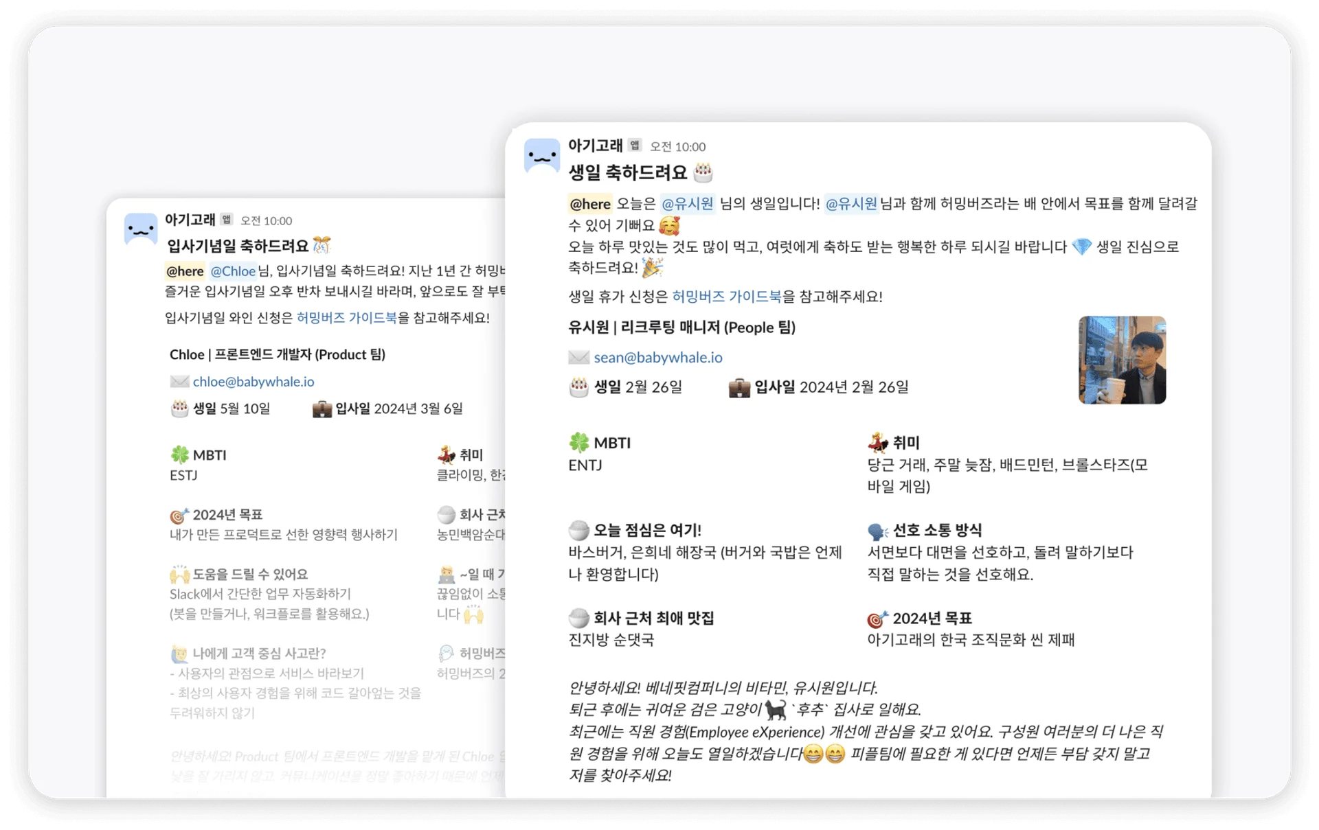 아기고래의 축하 기능을 활용하면 기념일 대상자의 프로필 카드를 기반으로 기념일 축하를 자동화할 수 있어요. 구성원이 직접 작성한 스스로에 대한 정보가 함께 드러나, 실질적으로 잘 모르던 다른 팀 구성원들의 기념일인 경우에도 서로를 인식하고 스레드로 축하의 마음을 건넬 수 있어요.