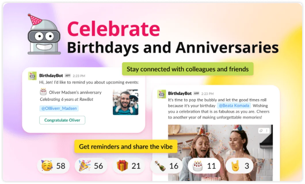 Birthday Bot도 구성원들의 생일과 입사 기념일 축하를 자동화시킬 수 있는 Slack 앱이에요.