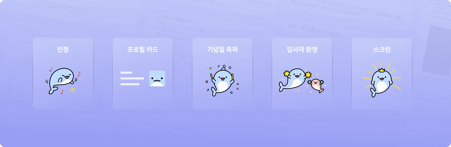 🐳(:고래:), ⭐(:별:), 🍪(:쿠키:)같은 기본 이모지부터, :아기고래:와 같은 우리 회사만의 정체성을 담은 이모지까지 모두 설정 가능합니다.