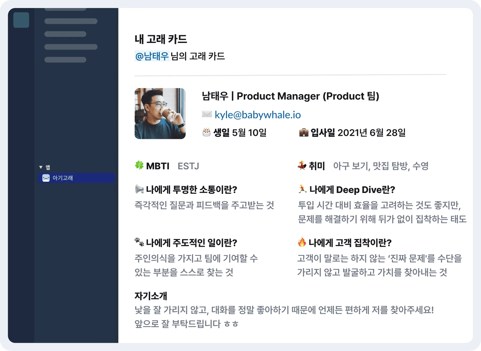 • 프로필 카드를 기반으로 생일과 입사 기념일을 축하를 자동화하고, 신규 입사자를 소개하는 기능 (축하/환영)