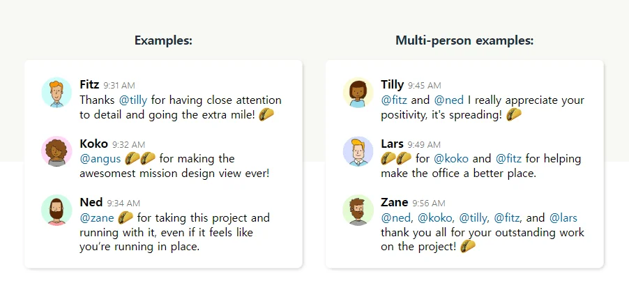 - 작은 규모의 팀에서도 신속하게 칭찬을 주고받을 수 있어요. 따로 설정 없이도 바로 사용할 수 있어서 빠른 속도와 맞아떨어집니다.