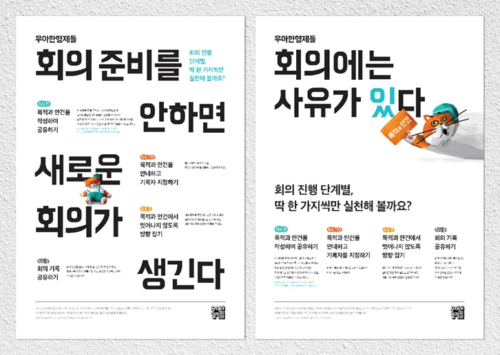 배달의민족은 “회의에는 사유가 있다”, “회의 준비를 안 하면 새로운 회의가 생긴다” 같은 기억하기 쉬운 메시지로 회의 문화 정착을 돕습니다. 주최자는 목적과 안건을 명확히 공유하고, 참석자는 자료를 사전 숙지해 참여하는 게 원칙이에요. 또 ‘회의 문화 서포터즈’를 운영해 좋은 사례와 개선점을 발굴하며 긍정적인 분위기를 확산합니다. 포스터, 배경화면, 스티커 등 다양한 시각 자료로 회의 에티켓을 전파해 구성원 스스로 회의 문화를 만들어가도록 독려하고 있습니다.