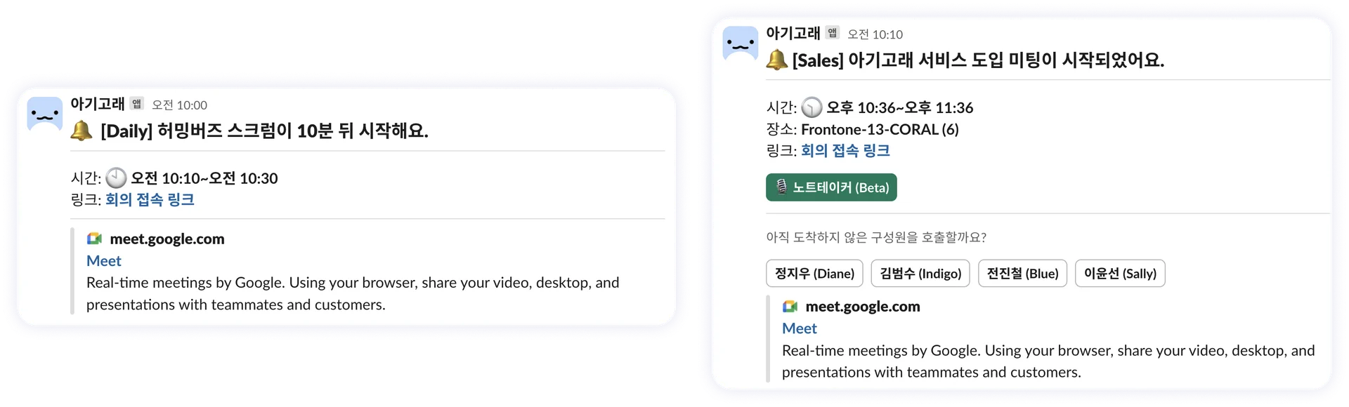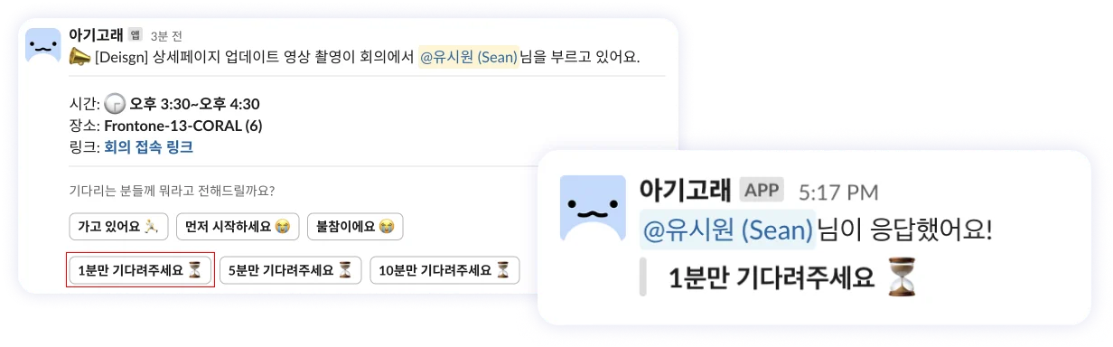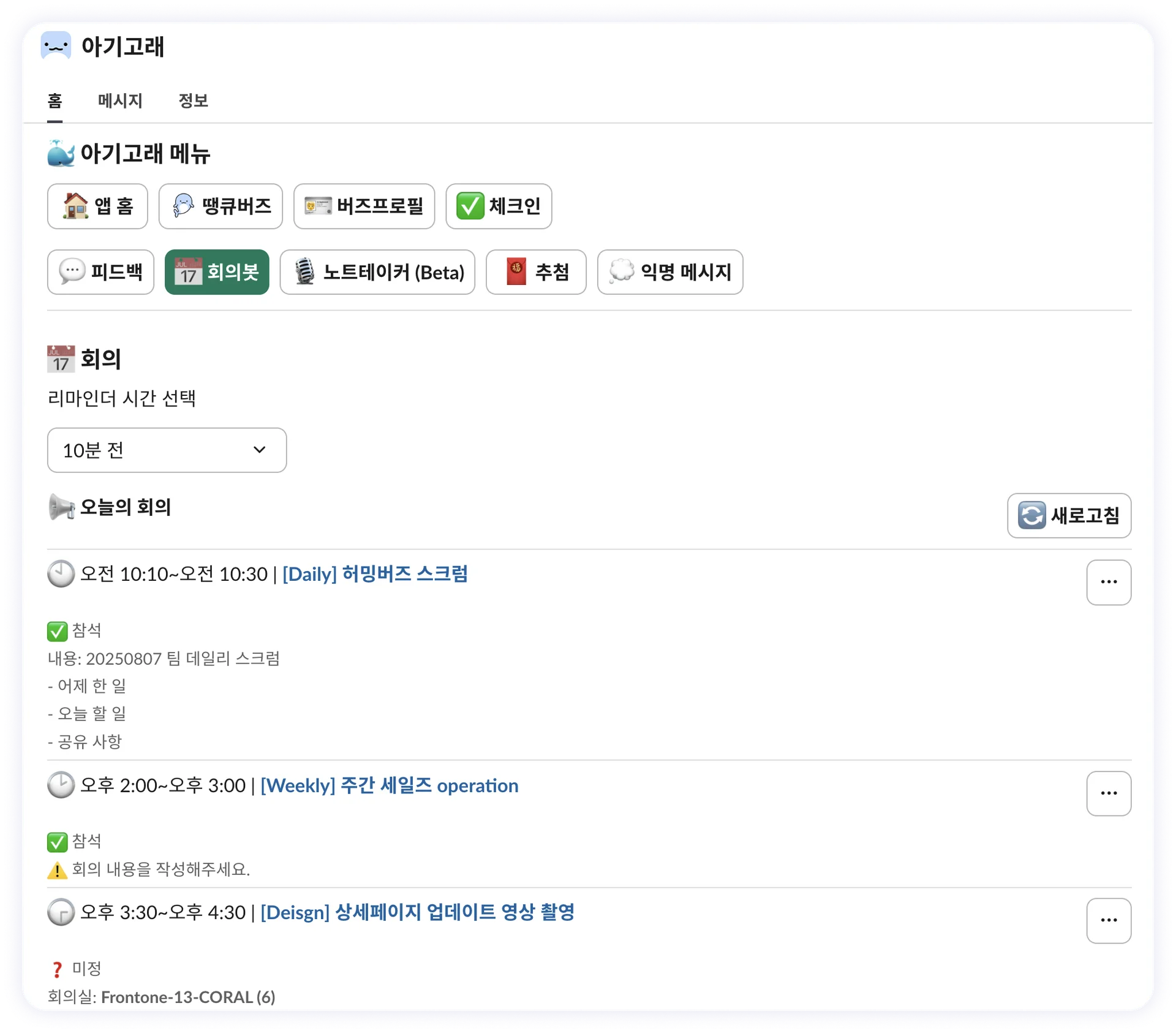 회의 일정 알림과 지각자 호출 같은 기능은 단순히 시간을 지켜주는 수준을 넘어, 필요한 사람들이 제때 모이고 회의가 계획대로 흘러갈 수 있도록 돕는 장치가 됩니다. 특히 지각자 호출을 익명으로 할 수 있어, 팀장이나 임원이 늦더라도 누구나 부담 없이 알릴 수 있죠. 덕분에 회의는 위계가 아니라 약속과 신뢰를 기반으로 운영되고, 수평적이고 투명한 문화가 자리 잡을 수 있습니다.
