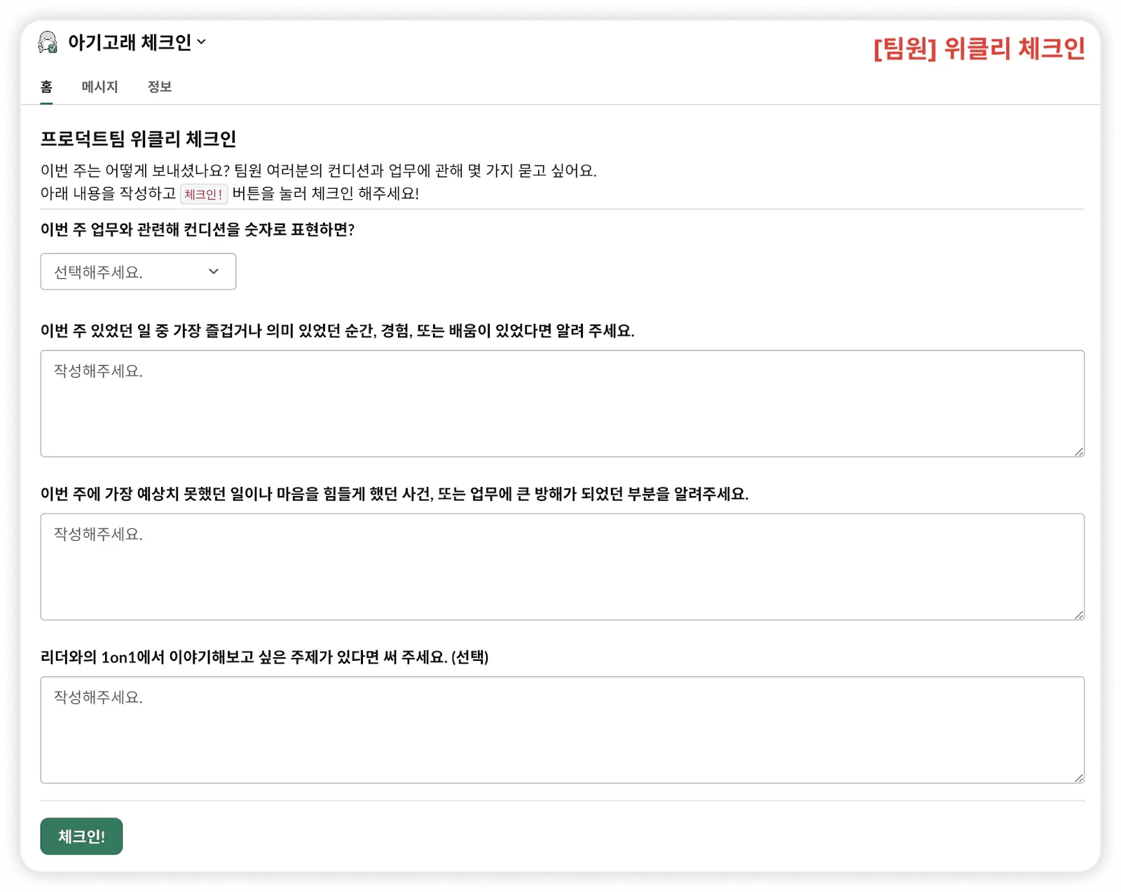 체크인을 활용해 팀 리더, 혹은 HR 팀에서는 팀원들의 업무 컨디션 상태와 현재 업무 상황에 대한 만족도를 쉽게 파악할 수 있죠.
