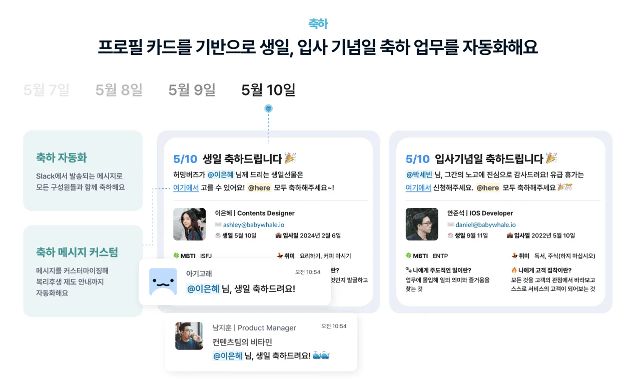 → 구성원 생일이나 입사기념일을 자동으로 축하하는 아기고래를 활용하면, 구성원 간 거리감을 감소시키고 구성원 만족도를 높일 수 있어요. 아기고래를 활용해 무료로 업무 자동화를 시작해 보세요.