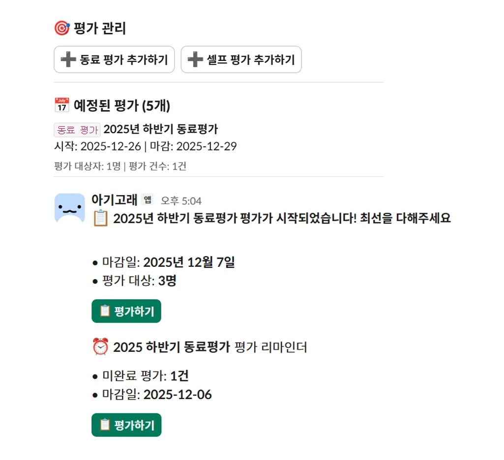 아기고래는 슬랙 환경에 맞춰 평가 및 성과관리 프로세스를 운영할 수 있게 해줘요. 동료평가와 셀프평가를 포함한 다면평가를 운영할 수 있어 실제 협업 과정 전반을 기준으로 성과를 정리할 수 있습니다. 평가 공지와 참여 요청이 슬랙 메시지로 전달되고, 구성원은 버튼 클릭이나 간단한 입력으로 응답할 수 있어요. 실시간으로 응답 현황을 확인할 수 있고, 미응답자에게 자동 리마인드를 발송할 수 있어 평가 참여율 관리와 일정 관리를 슬랙 안에서 통합 운영할 수 있어요.
