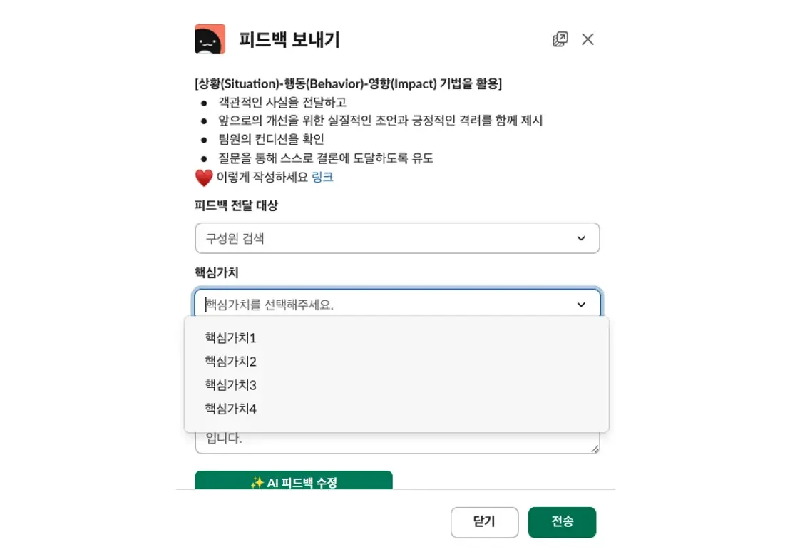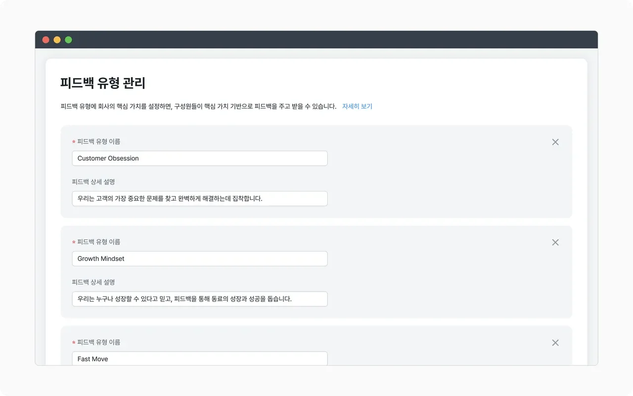 피드백 유형을 직접 설정하여 구성원 간 수시 피드백을 주고 받을 수 있어요. 구성원들은 시스템 내에서 언제든지 다른 구성원에게 피드백을 보낼 수 있으며, 공개 여부를 설정하여 모든 구성원이 볼 수 있게 하거나 받는 사람에게만 보여지도록 선택할 수 있습니다. 또한 기간별 피드백 건수, 유형 등 피드백 현황을 데이터로 관리할 수도 있습니다.