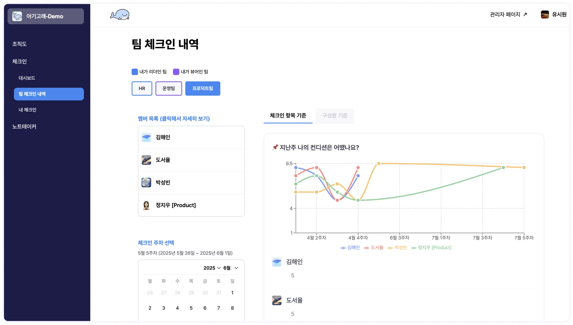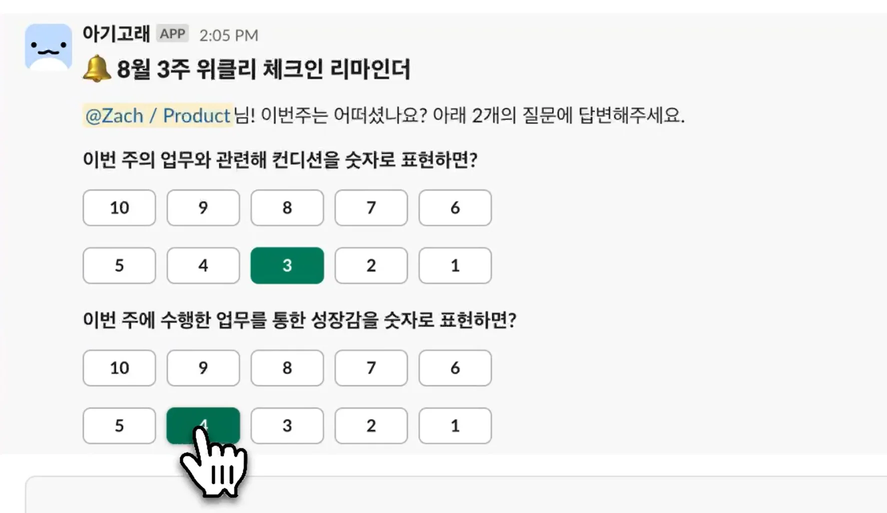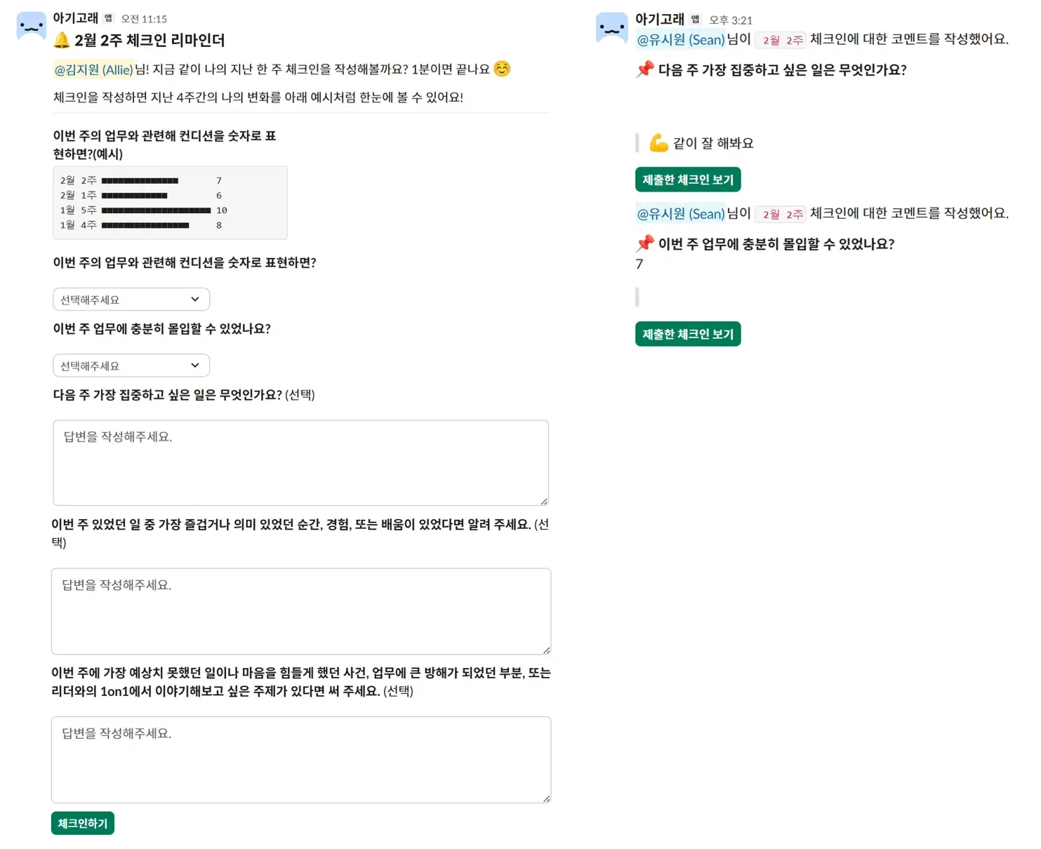 아기고래는 주기적인 체크인(Check-in)을 통해 구성원 상태를 지속적으로 파악하는 방식을 제공해요. 체크인은 리더가 일정 주기로 질문을 설정하면, 팀원들이 짧은 답변을 남기는 형태로 운영됩니다. 체크인 응답은 슬랙을 통해 리더에게 자동으로 전달되며 리더는 그에 대해 코멘트나 간단한 피드백을 남길 수 있습니다. 이 과정은 모두 슬랙 안에서 이루어지기에 별도의 1:1 미팅 일정을 잡지 않아도 구성원의 업무 상황과 컨디션을 주기적으로 확인할 수 있습니다.