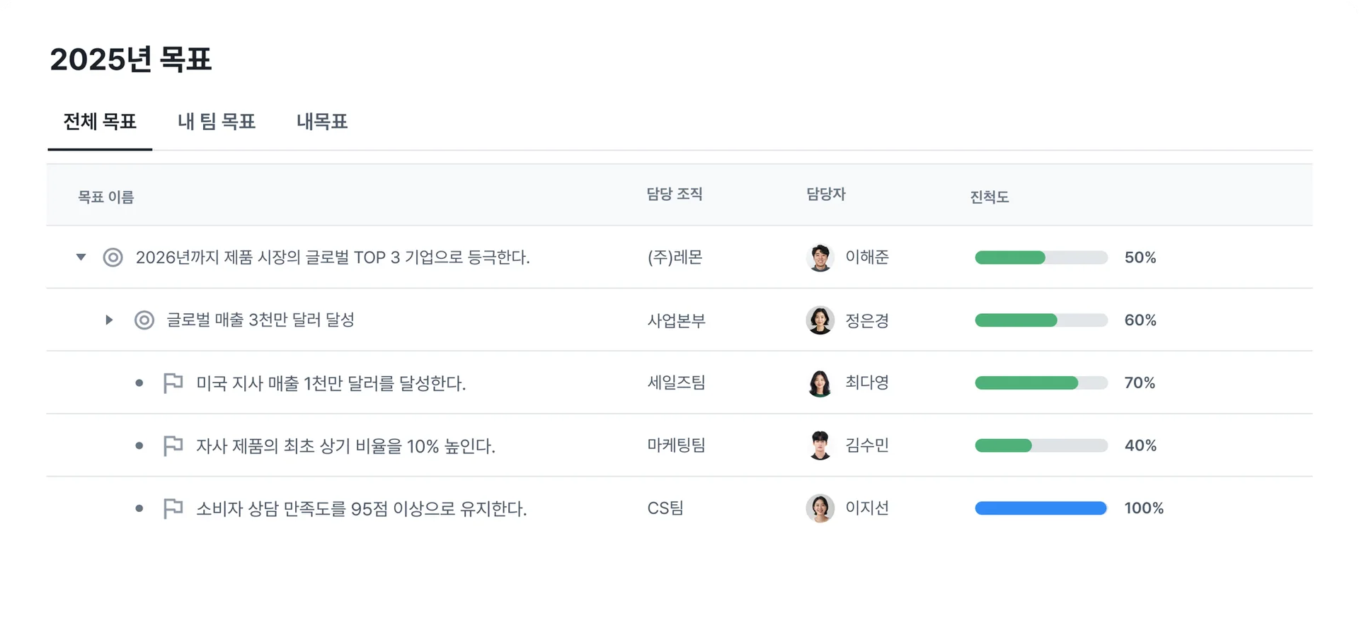 레몬베이스는 목표관리와 성과평가를 중심으로 성과관리 제도를 체계적으로 설계하고 운영하는 데 강점이 있습니다. OKR·KPI 기반 목표 설정부터 평가 설계, 피드백, HR 서베이까지를 하나의 시스템 안에서 관리할 수 있어요. 평가 단계 구성, 점수 체계 설정, 결과 분석과 이력 관리까지 데이터 중심으로 운영할 수 있어 성과를 제도와 연결해 관리하려는 조직에 적합합니다.