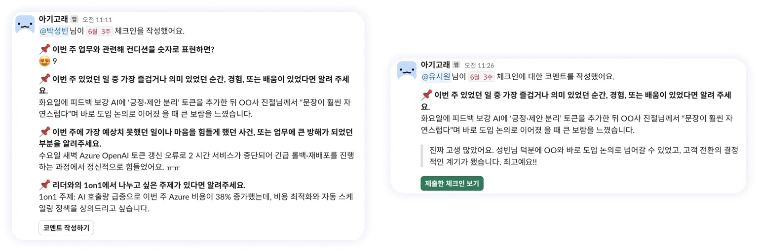위클리 체크인은 매주 간단한 질문으로 리더가 팀 구성원의 상태를 파악할 수 있도록 도와줍니다. 원온원 미팅을 위한 별도 시간을 잡지 않아도, 매주 구성원의 목소리를 확인하고 필요한 지원을 이어갈 수 있어요.