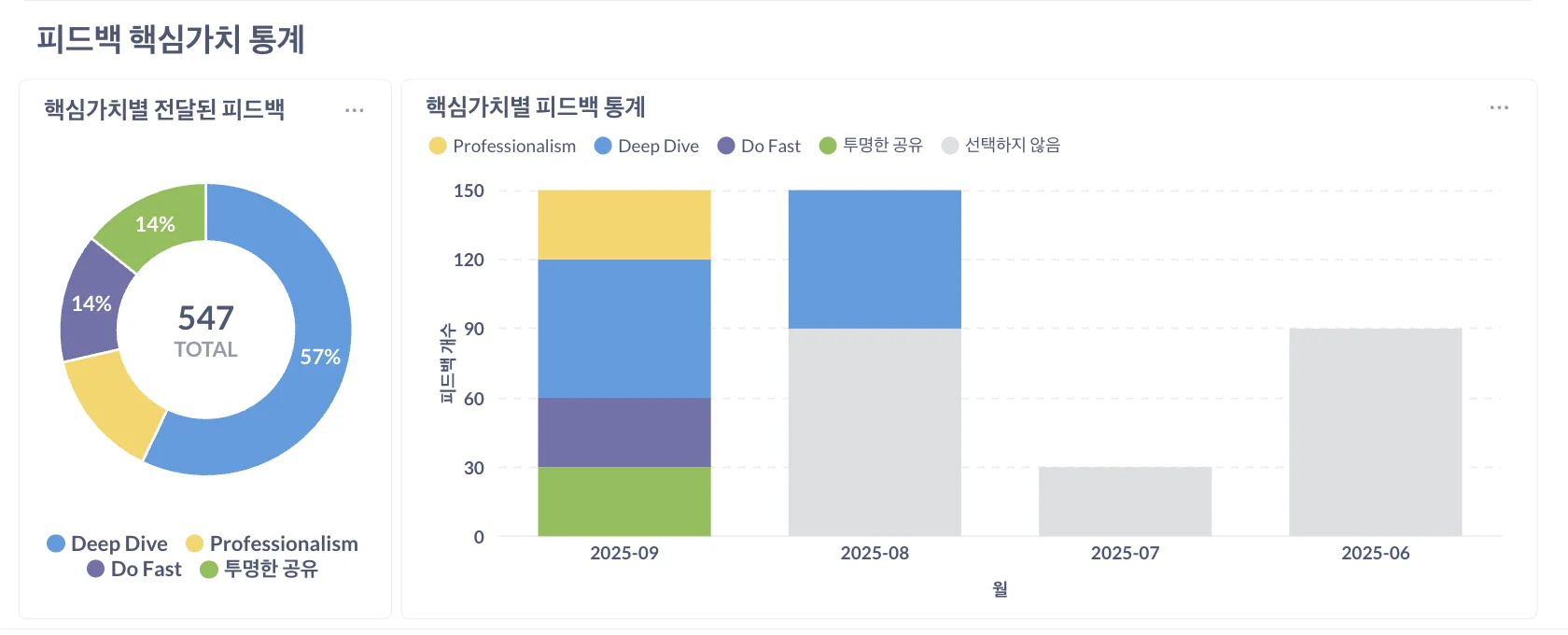 주고받은 피드백은 데이터로 기록되어, 보낸 사람과 받은 사람, 피드백 내용, 익명 여부, 전달 시점, AI 활용 여부까지 세부적으로 관리할 수 있습니다. 가장 많이 피드백을 주고받은 구성원 순위도 집계할 수 있어, 팀 내 소통의 흐름과 협업의 밀도를 객관적으로 파악할 수 있습니다.