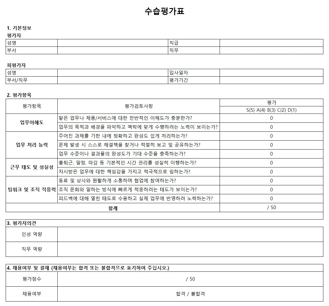 공정하고 체계적인 수습평가를 위해서는 평가 기준을 명확히 정하고 표준화된 평가표를 활용하는 것이 좋습니다.