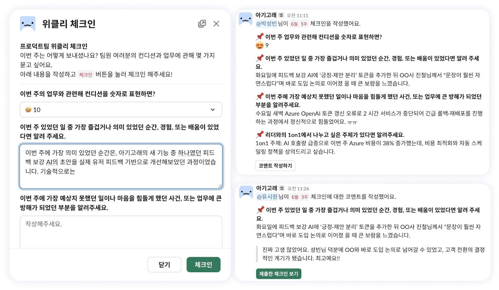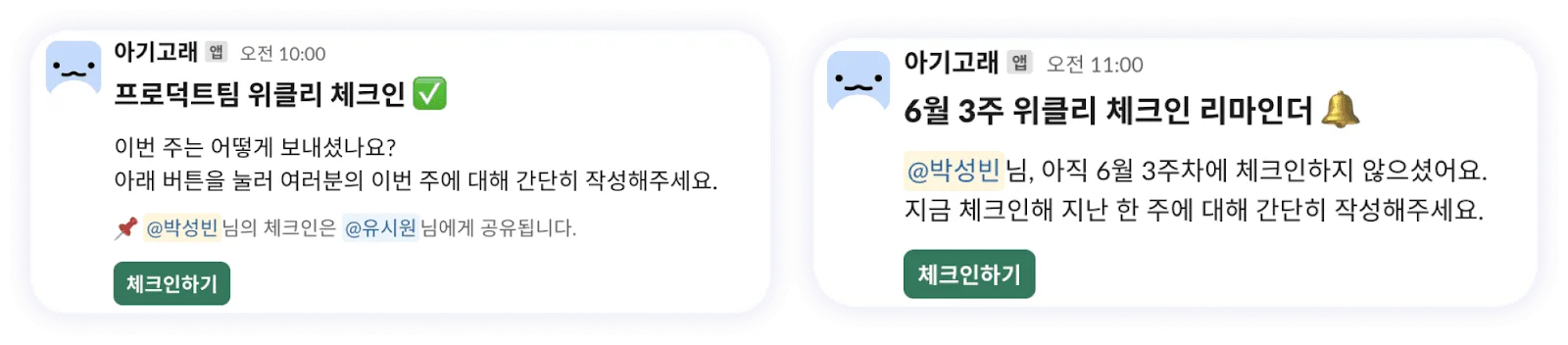 체크인 항목을 셋팅해 두면 매 주 체크인 요청이 슬랙에서 자동 발송되고, 미제출자에게는 리마인더가 보내져요.