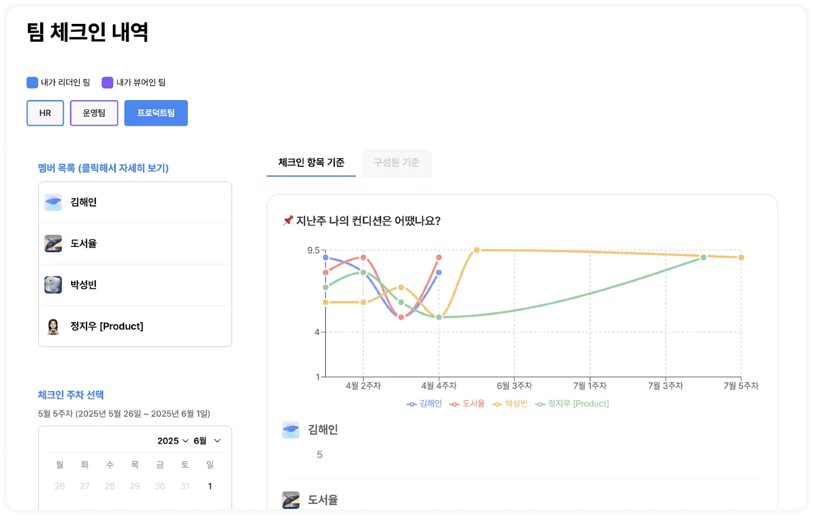 리더는 구성원이 제출한 체크인을 확인하고 코멘트할 수 있고,