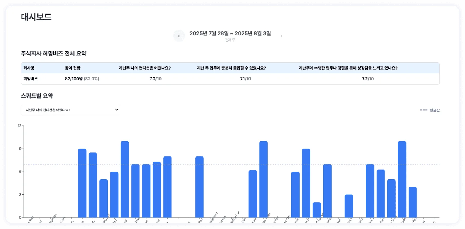 이렇게 펄스 서베이를 진행하고 그 추이를 모아볼 수 있으면, 구성원들이 업무 컨디션, 몰입도, 성장감 등에 대해서 주 단위로 어떻게 느끼고 있는지 적은 리소스로 파악하고, 구성원과의 대화가 필요한 순간에 리더가 빠르게 대응할 수 있어요.