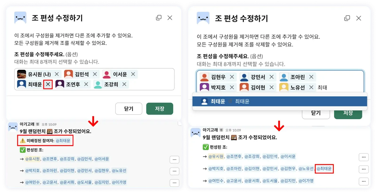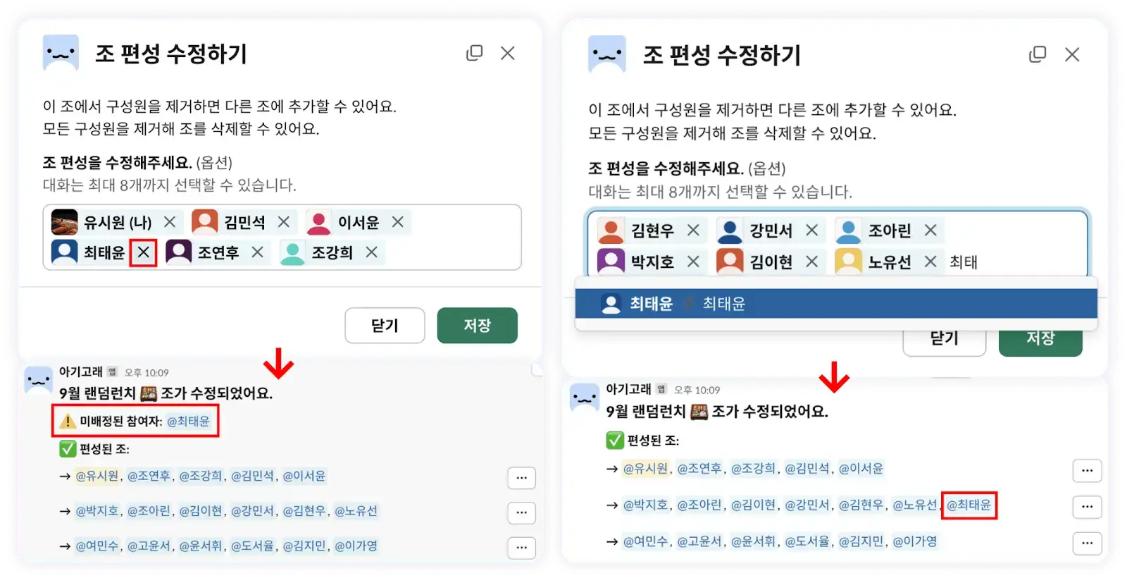 참여자 모집이 마감되면 아기고래가 랜덤 런치 조 편성 초안을 관리자에게 DM으로 전달해요. 관리자는 이 초안을 확인한 뒤 필요한 경우 조원을 추가하거나 제외해 조를 조정할 수 있습니다.