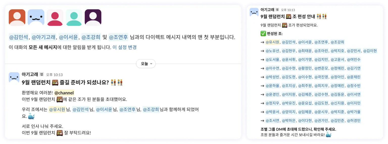 아기고래는 슬랙 앱 형태로 제공되기에 랜덤 런치 참여자 모집부터 랜덤 조 편성, 결과 안내까지 모든 과정이 슬랙 안에서 이루어집니다.