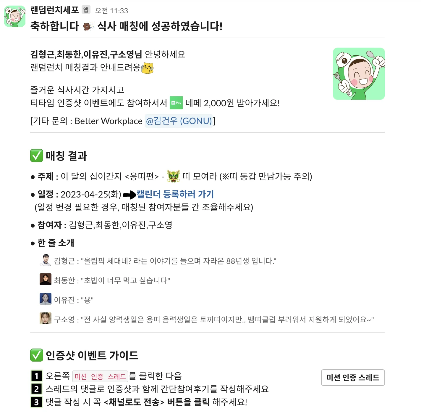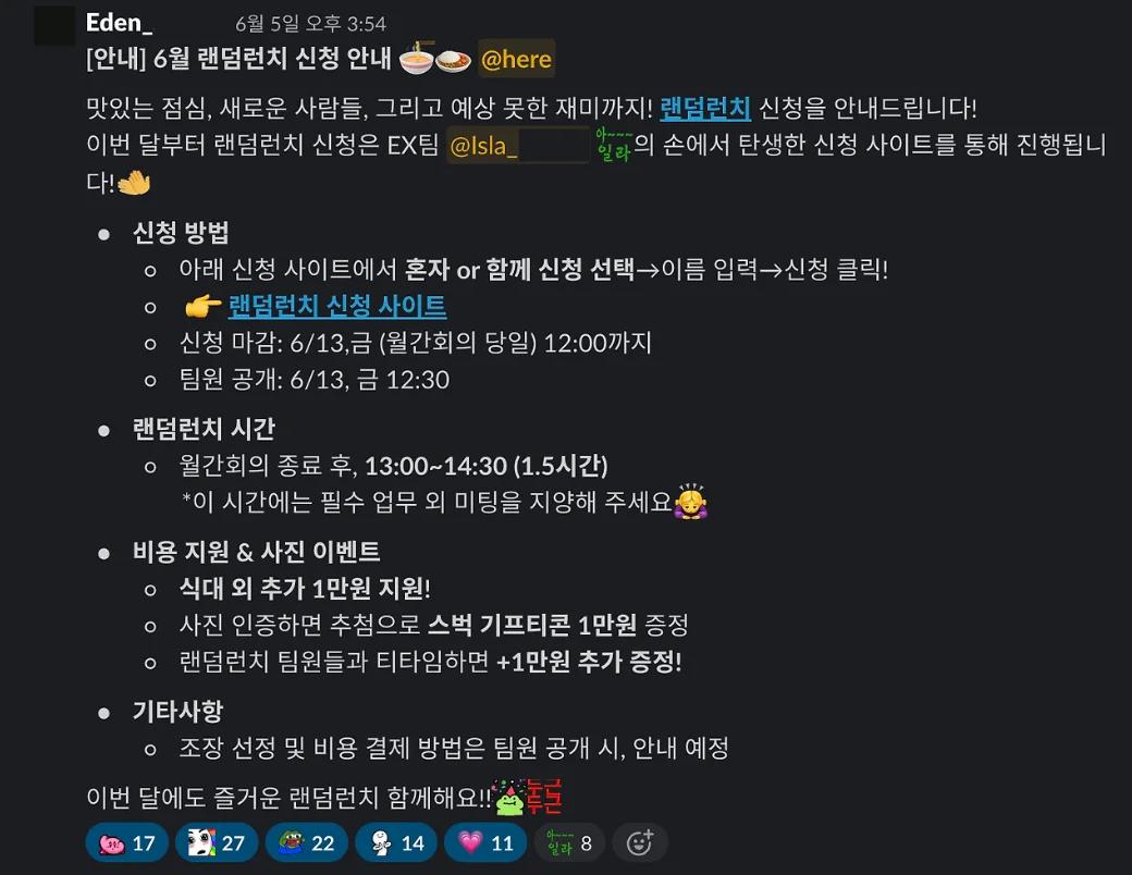 조가 확정되면 슬랙에서 조별 DM이 개설되고 점심 장소를 정해 식사를 진행합니다. 더욱 활발한 랜덤 런치 운영을 위해 점심 시간은 일반 근무일보다 길게 운영되고 식사 비용도 회사에서 추가 지원해 줍니다. 랜덤 런치 이후에는 조별 식사 후기를 슬랙 채널에 사진과 함께 공유하여, 후기 참여자를 대상으로 소정의 혜택을 제공해 참여를 유도하고 있습니다.