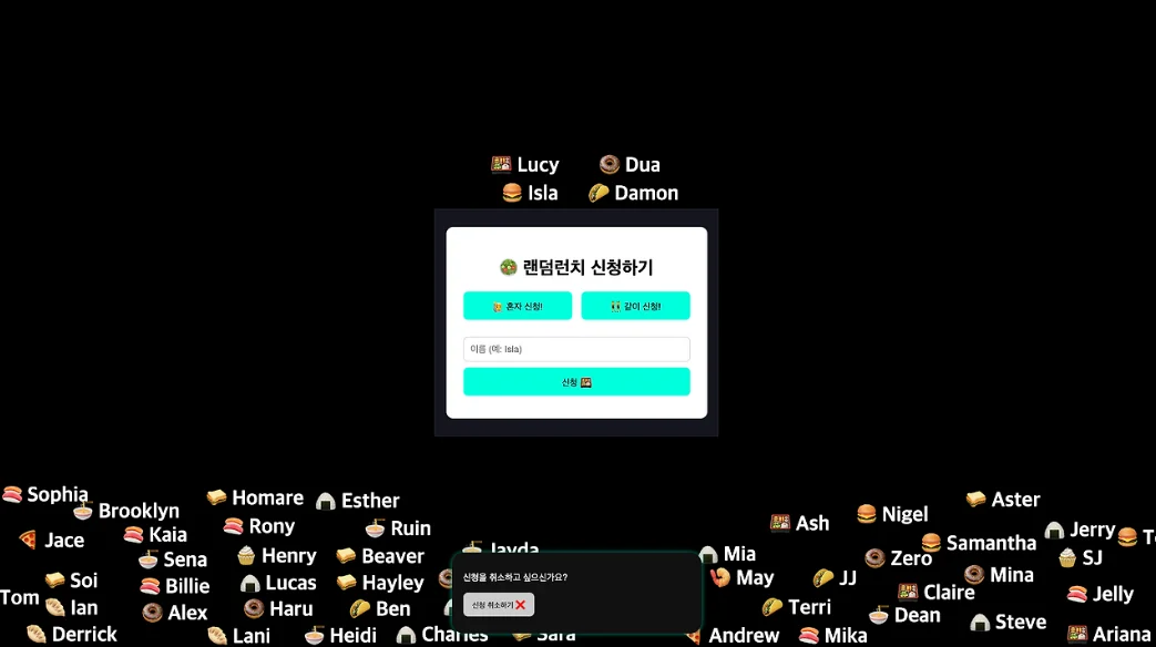 참여 방식은 사전 신청 형태로 이루어집니다. 구성원은 랜덤 런치 신청 페이지에서 이름을 입력해 참여를 신청하며 최대 1명까지 짝으로 함께 신청할 수 있어요.