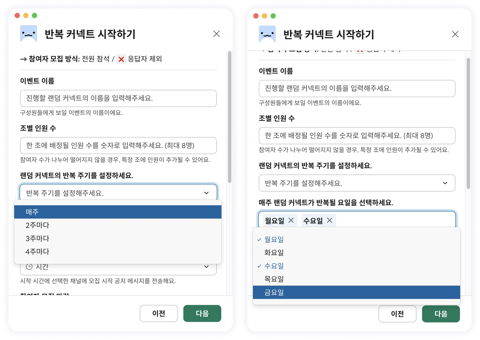 반복 커넥트를 설정해 두면 이후에는 관리자의 추가 작업 없이 동일한 방식으로 랜덤 런치가 진행됩니다. 지정된 시간에 참여자 모집이 자동으로 시작되고 모집 마감 시점에 참여자를 기준으로 랜덤 런치 조가 자동으로 편성됩니다. 편성 결과는 설정한 슬랙 채널에 바로 안내됩니다.