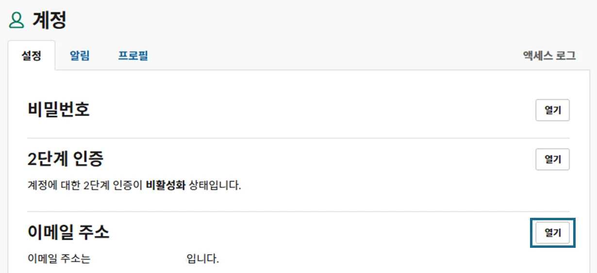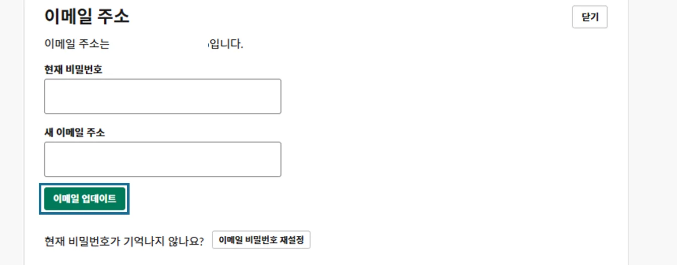 열기버튼을 눌러요.현재 비밀번호 및 새 이메일 주소를 입력한 다음