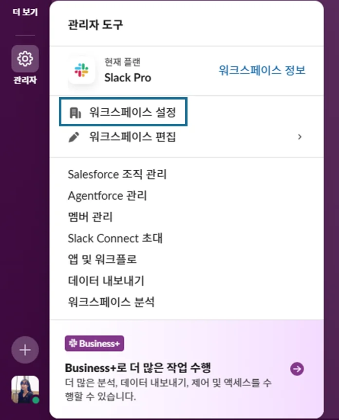 관리자메뉴를 클릭하고,워크스페이스 설정을 선택해요.왼쪽 메뉴에서