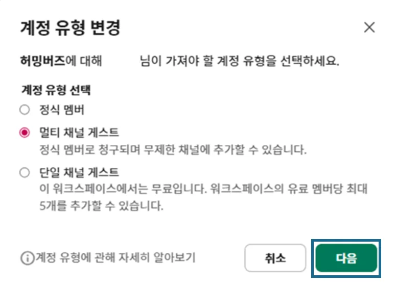 슬랙에서는 게스트의 계정 유형을 필요에 따라 변경할 수 있어요.