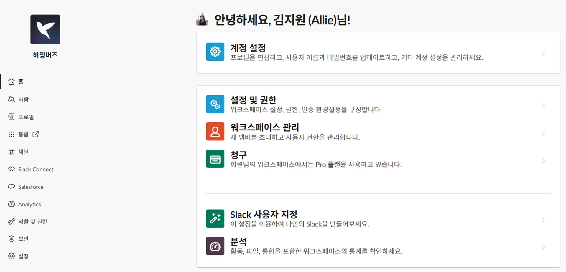 관리자 페이지의 홈에는 주요 관리 기능들에 대한 요약과 빠른 액세스 링크가 제공됩니다. 예를 들어 계정 설정 섹션에서는 관리자 본인의 프로필 수정, 비밀번호 업데이트와 같은 계정 관련 설정으로 이동할 수 있고, 설정 및 권한 섹션에서는 워크스페이스의 기본 설정과 멤버 권한을 변경할 수 있는 메뉴로 연결됩니다. 워크스페이스 관리, 청구, 슬랙 사용자 지정, 분석 등으로 구분된 카드들은 각각 해당 관리 화면으로 바로가기 역할을 합니다.