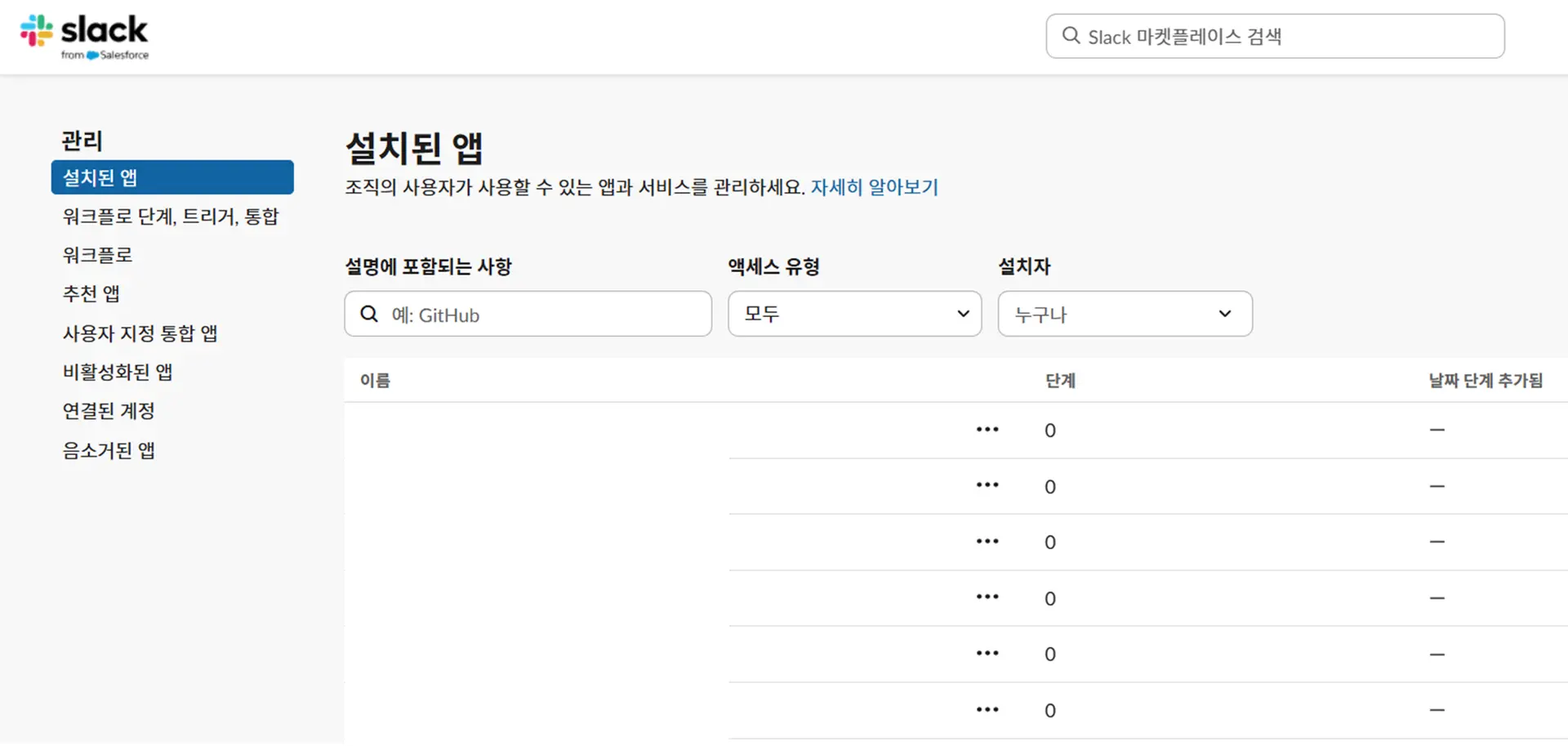 통합 탭에서는 슬랙과 외부 서비스 간 연동 설정도 관리할 수 있어요. Google 캘린더나 GitHub와의 통합을 위해 연동 계정을 연결하거나, 사용자 지정 통합 앱이 있는 경우 해당 항목 관리할 수 있습니다.