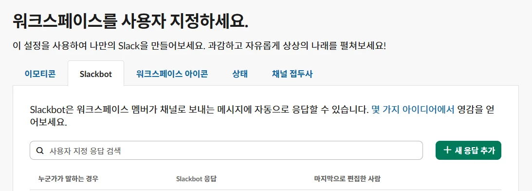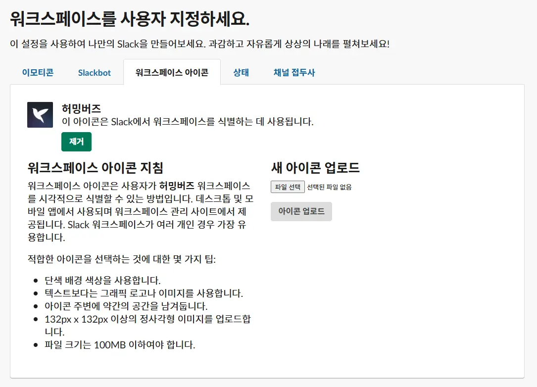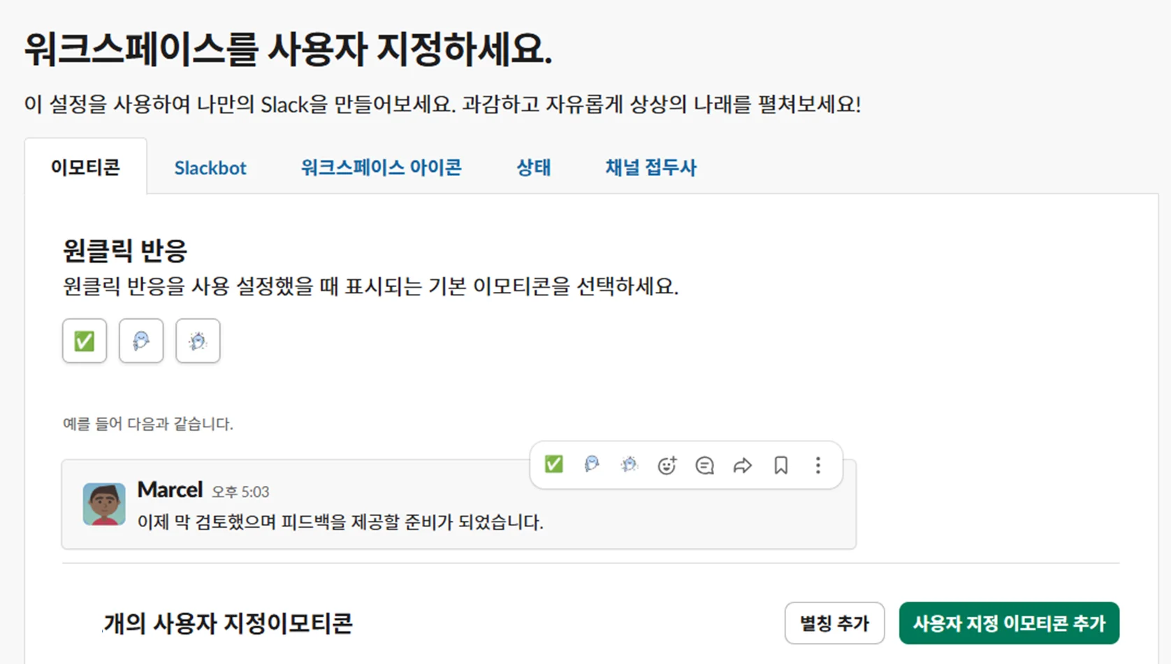 워크스페이스 관리자는 설정-사용자 지정 페이지를 통해 슬랙 워크스페이스의 사용자 정의 항목을 설정하여 커스터마이징할 수 있어요.