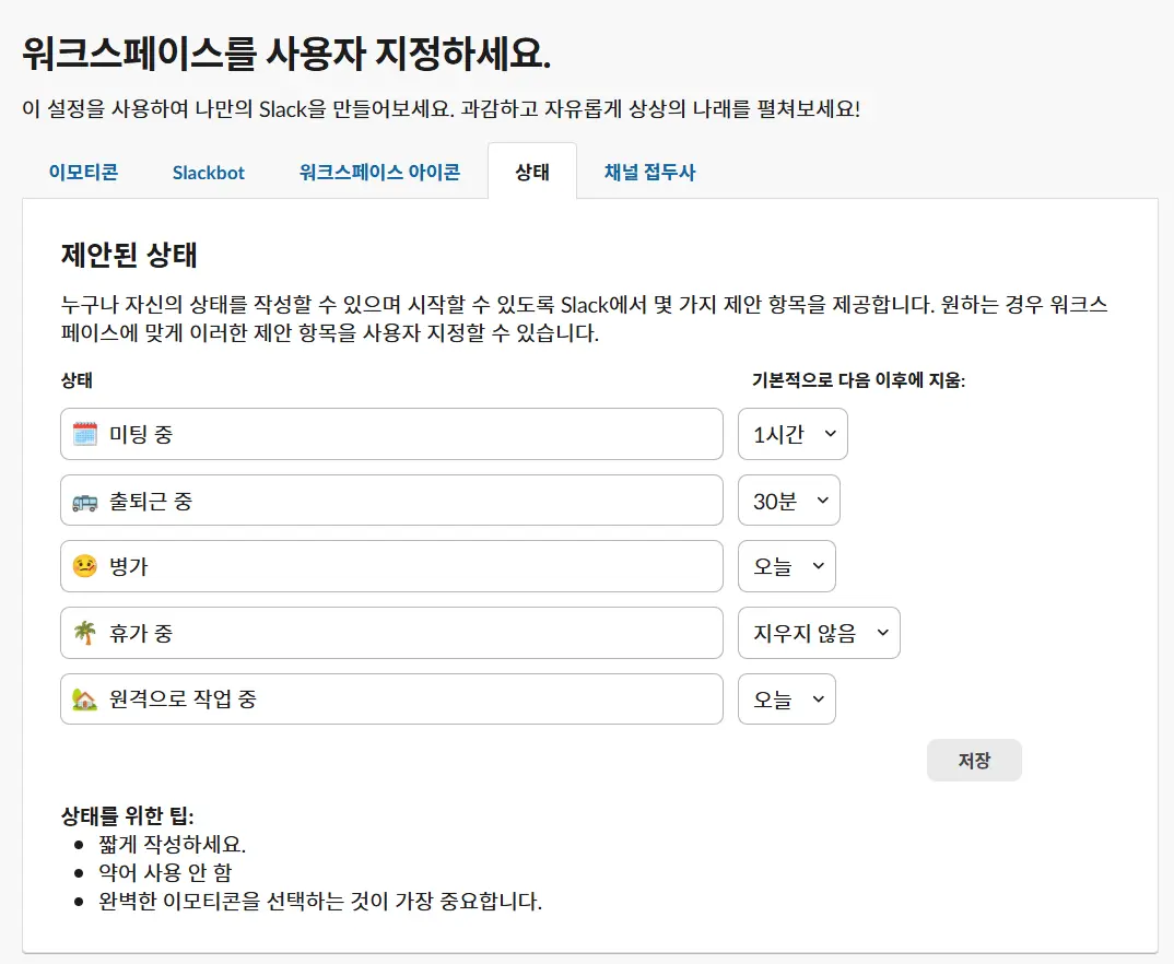 상태 설정은 워크스페이스 멤버들이 자신의 현재 상황(예: 회의 중, 집중 업무 중, 부재 중)을 동료들에게 공유하는 기능이에요. 관리자는 사용자 지정 페이지에서 멤버들이 간편하게 선택하고 적용할 수 있도록 표준화된 상태 옵션 목록을 생성하고 관리할 수 있어요. 상태를 설정할 때는 이모티콘을 포함하여 명확하게 정의하고, 일관성 유지를 위해 표준화된 시간 설정(예: 30분 후 자동 해제)을 지정할 수 있습니다.