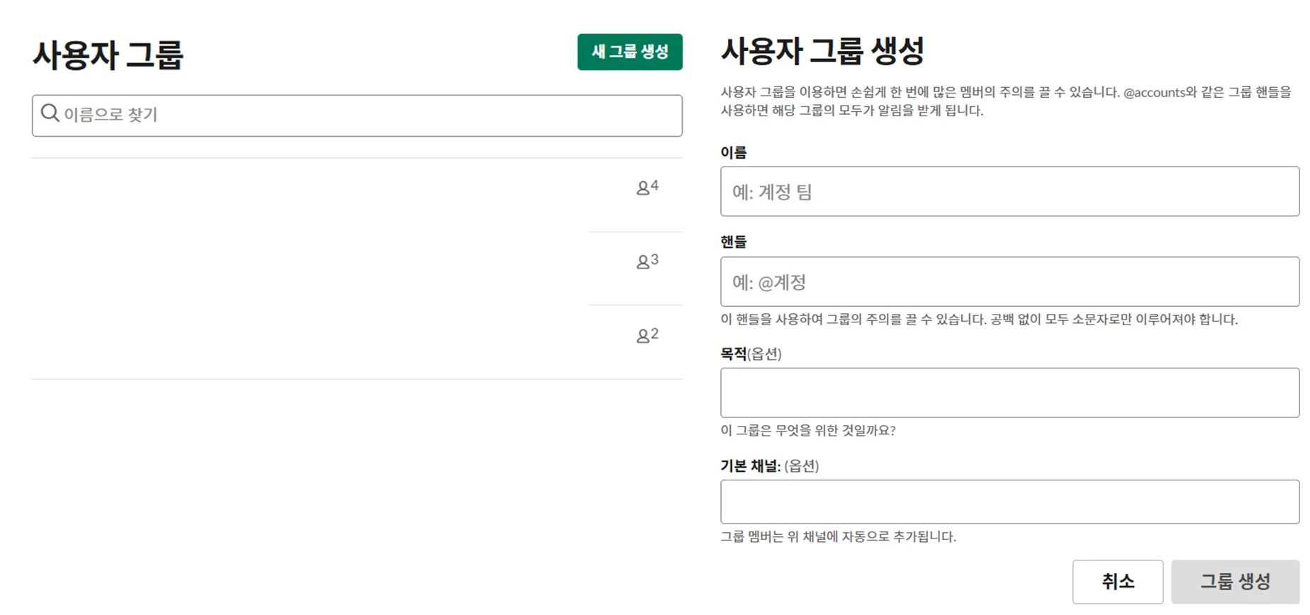 사용자 그룹 탭은 Pro 플랜 이상에서 제공되는 기능으로, 여러 멤버를 하나의 그룹으로 묶어 관리할 수 있어요. 사용자 그룹을 활용하면 팀/부서별 그룹을 만들어 한 번의 멘션으로 그룹 전체에게 알림을 보내거나, 채널에 그룹 전체를 손쉽게 추가할 수 있어요. 관리자는 새로운 사용자 그룹을 생성하고, 기존 그룹의 멤버 구성을 변경하거나 그룹을 삭제할 수도 있습니다. 새 그룹 생성 버튼을 누르고, 그룹 이름과 핸들(멘션 이름), 그룹에 속할 멤버 및 기본 채널 목록을 설정하면 새로운 그룹이 생성됩니다. 이렇게 만든 사용자 그룹은 해당 그룹에 속한 멤버가 변경되더라도 멘션이나 채널 초대 시 그룹 이름만 지정하면 항상 최신 구성원에게 적용돼요.