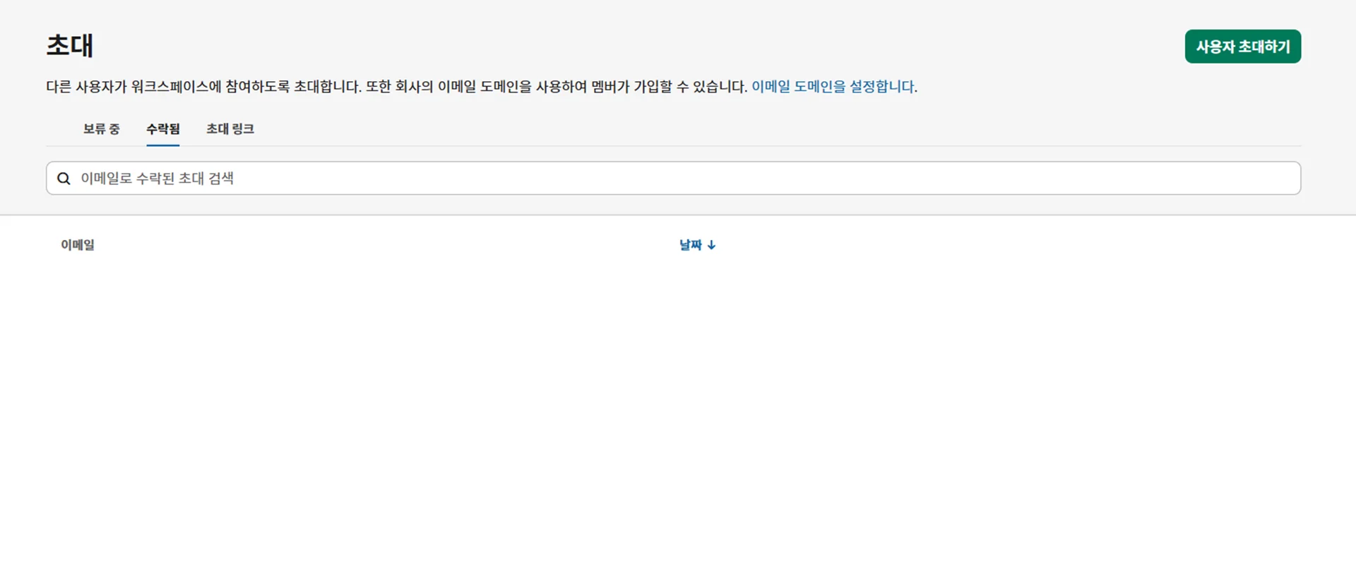 초대 탭에서는 워크스페이스로 초대한 사용자의 현황과 초대 관련 설정을 관리할 수 있어요. 멤버 탭 상단의 사용자 초대하기 버튼을 눌러 새로운 사용자를 워크스페이스에 초대할 수 있어요. 또한, 보류 중인 초대를 확인하고 관리할 수 있고, 필요에 따라 초대를 취소하거나 초대 이메일을 재발송할 수 있어요. 각각의 초대에는 이메일 주소, 초대 보낸 날짜, 초대한 사람, 초대 타입(정규 멤버/게스트) 등의 정보가 표시되며, 관리자는 여기서 특정 초대를 취소하거나 초대 이메일을 다시 발송할 수 있습니다. 대시보드 형식으로 지난 초대 내역과 만료된 초대도 조회할 수 있어, 워크스페이스에 누가 언제 초대되었는지 기록도 관리할 수 있어요.