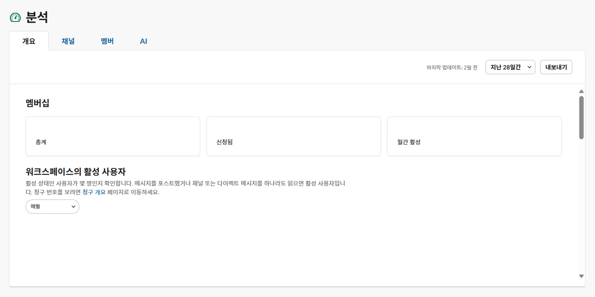 슬랙 관리자 페이지: 분석(Analytics) 탭