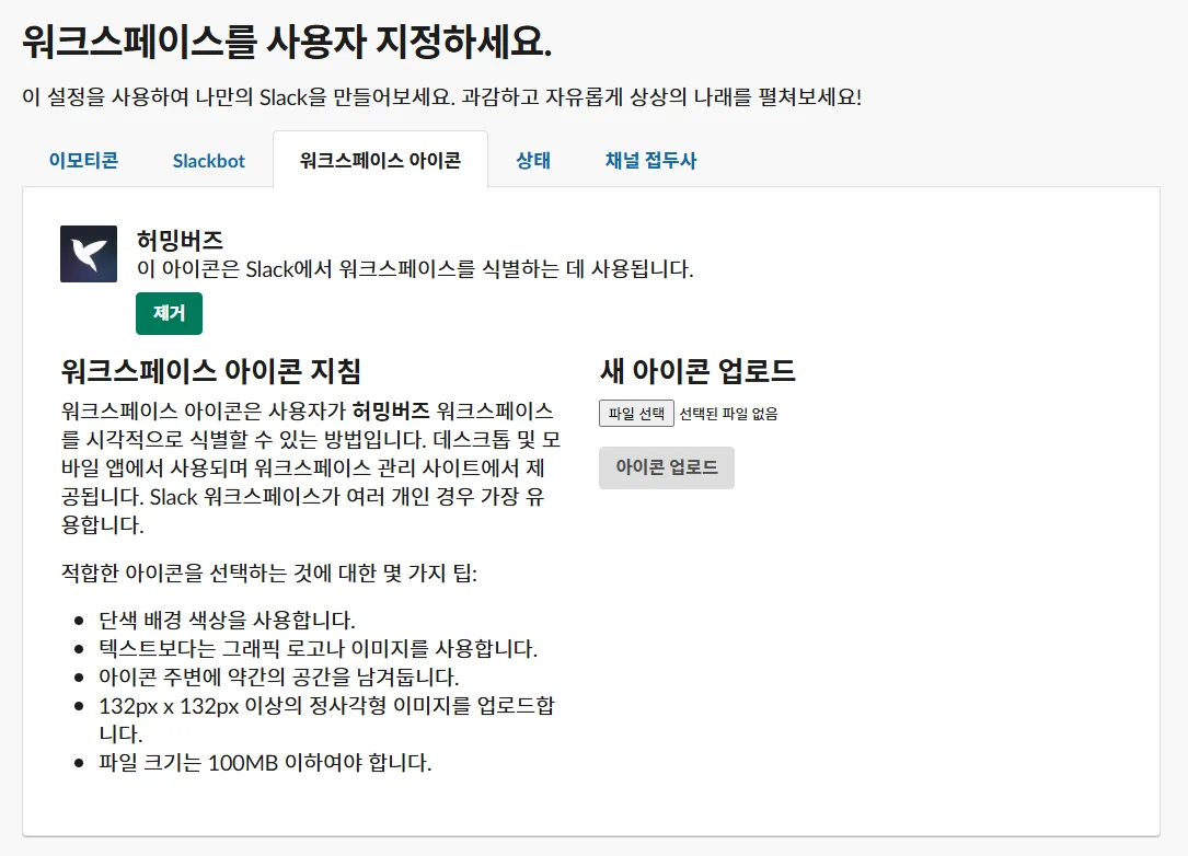 워크스페이스 아이콘은 사이드바 상단에 표시되는 작은 로고 이미지로, 팀이나 회사의 로고로 설정할 수 있어요. 워크스페이스 아이콘 탭에서 새로운 이미지를 업로드하여 아이콘을 변경할 수 있습니다. 아이콘 업로드 후 저장하면 모든 멤버의 슬랙 애플리케이션에 즉시 새로운 아이콘이 적용돼요.