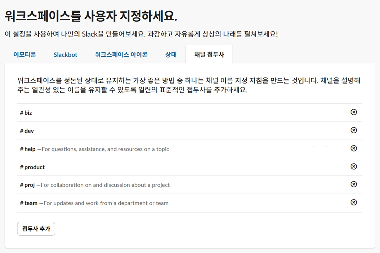 채널 접두사는 워크스페이스 내 채널 이름 지정 규칙을 통일하고 채널 검색 및 관리를 용이하게 하기 위한 구조화 도구입니다. 관리자는 채널 생성 시 멤버들이 채널 이름 앞에 붙일 수 있도록 접두사 목록을 제공할 수 있어요(예: #proj-, #team-, #topic- 등). 이 기능의 목적은 워크스페이스 구조의 일관성 확보예요. 모든 채널이 프로젝트, 팀, 주제 등 명확한 카테고리 분류 기준에 따라 분류되도록 하여, 관련 채널을 그룹화하고 빠르게 검색할 수 있도록 할 수 있어요.