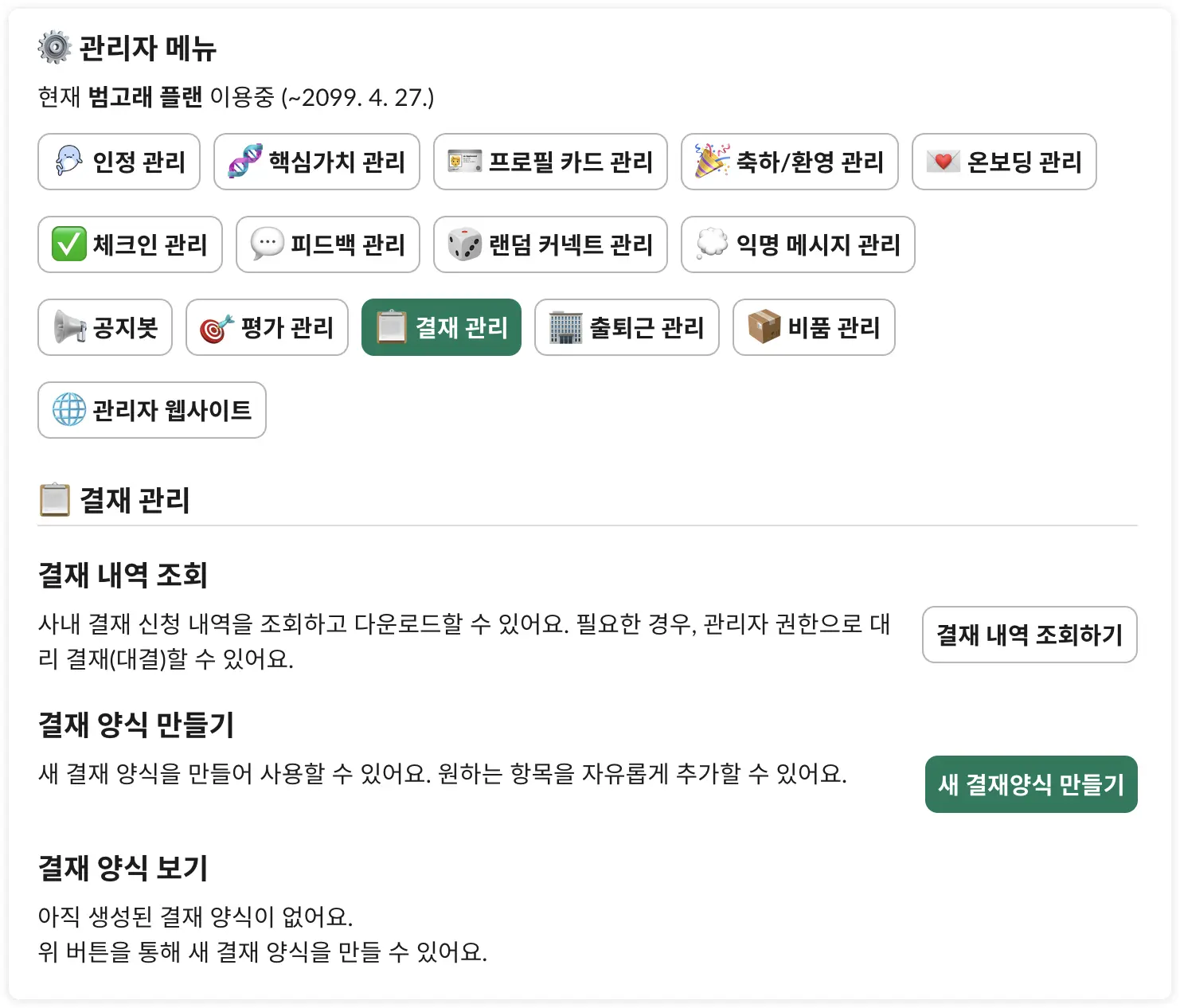 결재 양식은 관리자 메뉴에서 새로 만들 수 있고, 양식명, 설명, 결재선, 항목 유형 등을 설정할 수 있어요.
