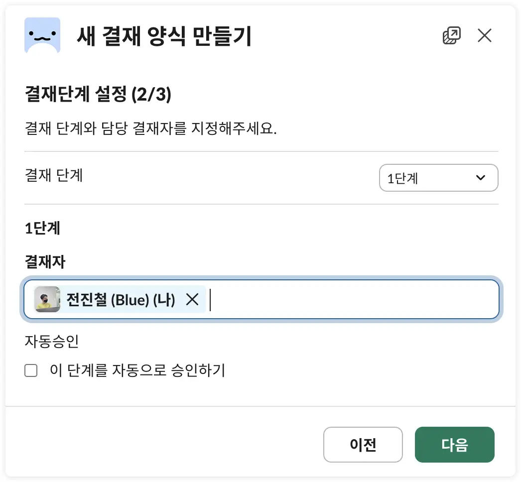 결재선은 최대 5단계까지 설정할 수 있고, 각 단계에서 여러 명의 결재자를 지정할 수 있어요. 특정 단계에서는 자동승인 옵션을 통해 별도 결재 없이 바로 승인 처리되는 설정도 활용할 수 있습니다.
