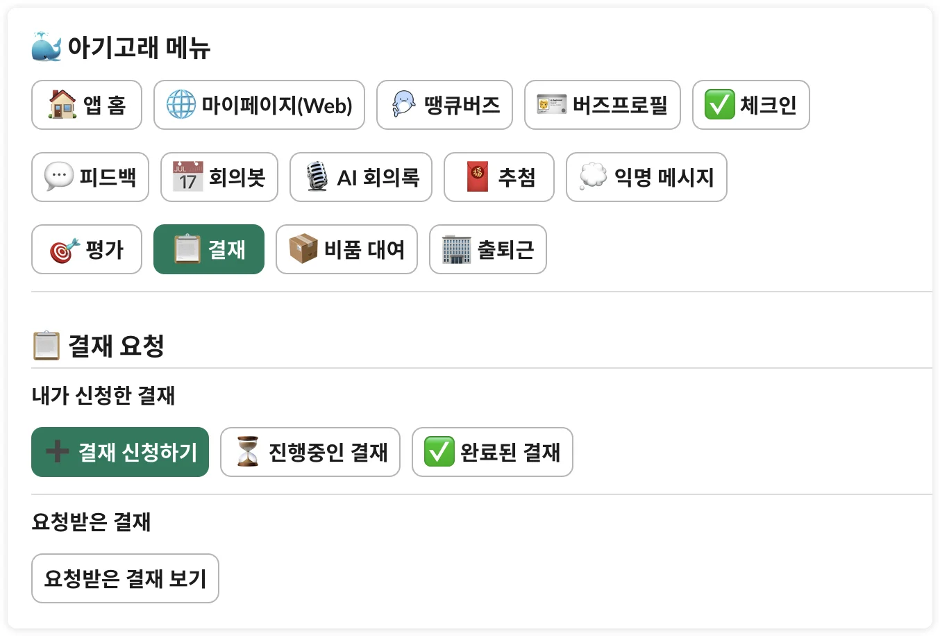 아기고래는 회사 내에서 발생하는 업무 요청, 구매 요청, 복지 신청 등 다양한 결재 문서들을 슬랙 안에서 바로 처리할 수 있게 도와줍니다.