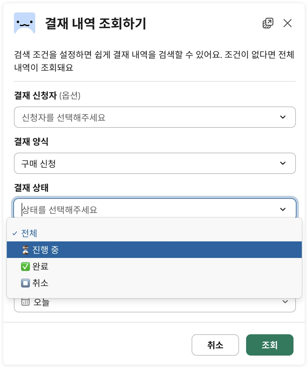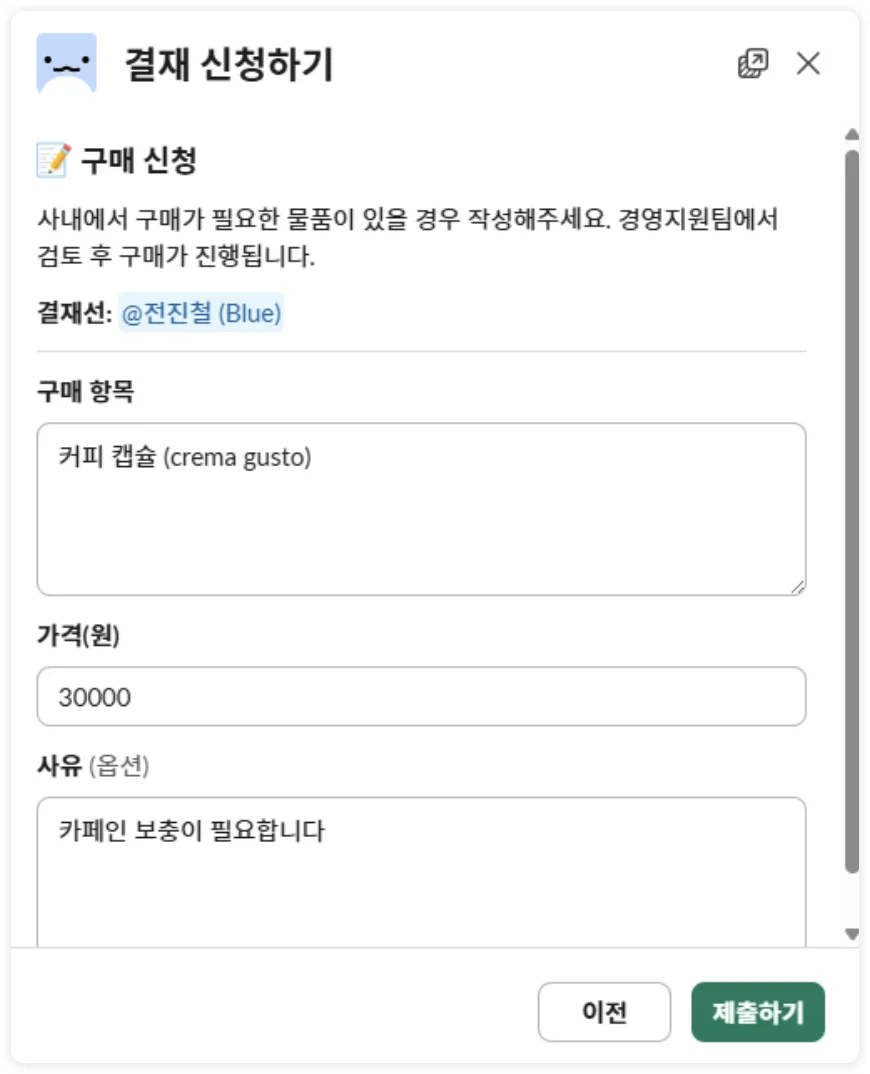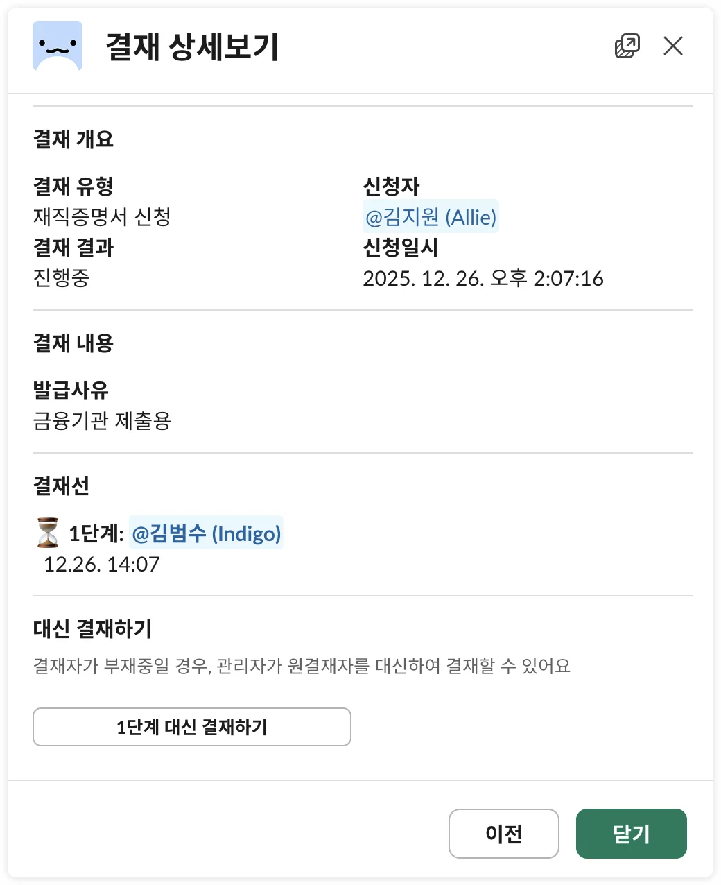 별도 페이지로 이동할 필요 없이 슬랙에서 결재를 요청하고 승인까지 진행할 수 있어요.