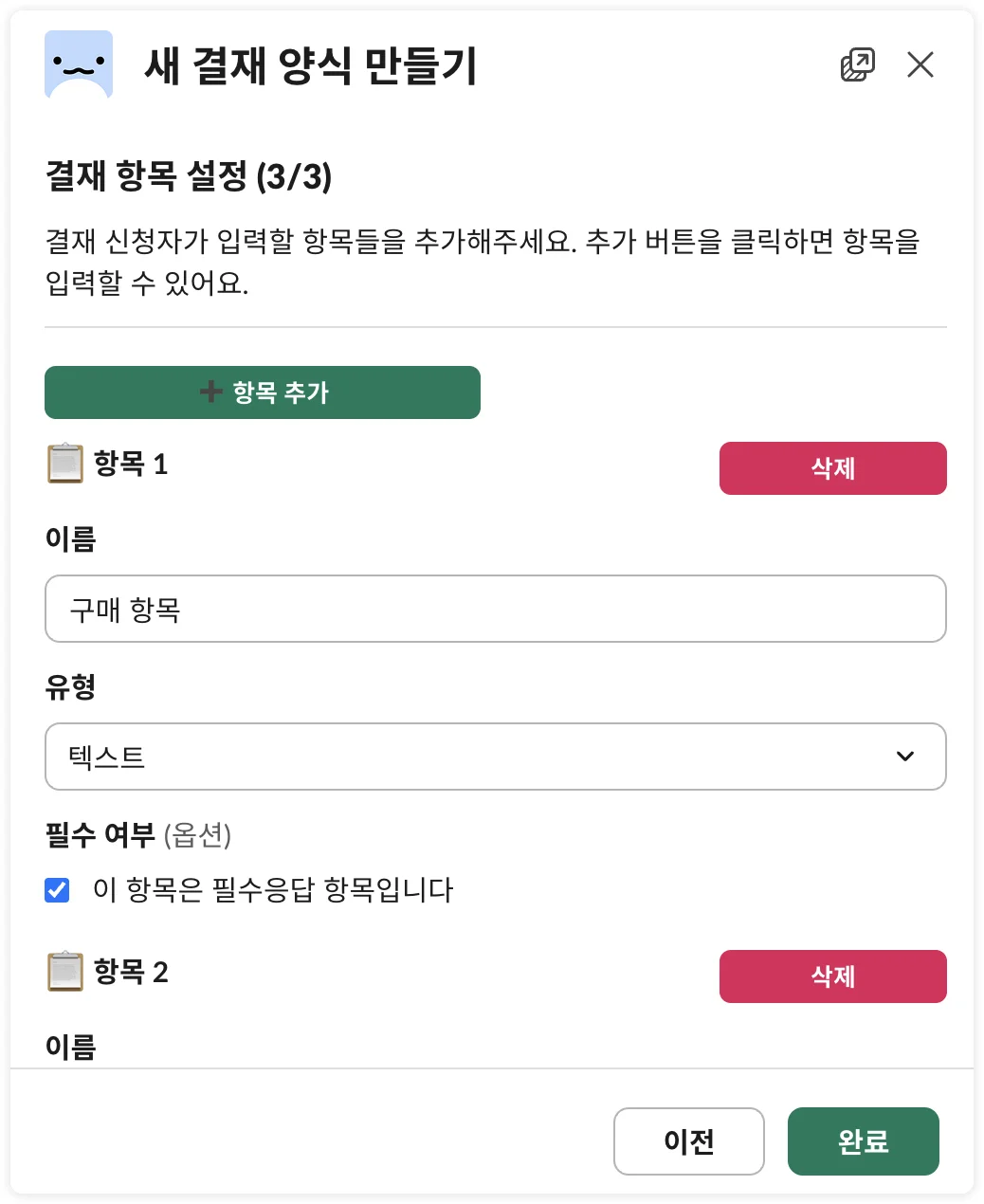 양식 설정이 완료되면 필요한 항목(텍스트, 숫자, 날짜 등)을 추가해 결재 문서가 어떤 정보를 포함해야 하는지 정할 수 있어요. 완성된 양식은 앱 홈의 결재 목록에서 확인할 수 있고 필요에 따라 나중에 수정 및 삭제도 가능합니다.